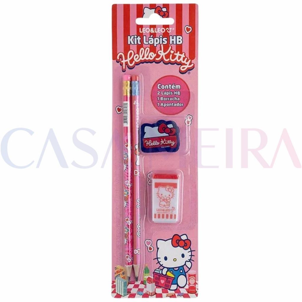 Seja bem vindo a Casa Meira!!! O Kit Hello Kitty 4 itens acompanha: 2 lápis grafite HB 1 apontador 1 borracha Composição -Lápis: corpo em resina termoplástica e pigmentos, virola de alumínio e borracha em resina plástica. -Apontador: resina termoplástica e lâmina em aço inox. -Borracha: isenta de pvc, carga inerte e pigmentos atóxicos. Entrega e Logística: Após a postagem do produto dentro do prazo, todo o processo de transporte e entrega é de responsabilidade exclusiva da Shopee e de suas transportadoras parceiras. Os vendedores não possuem controle sobre os prazos e não têm contato direto com os entregadores.