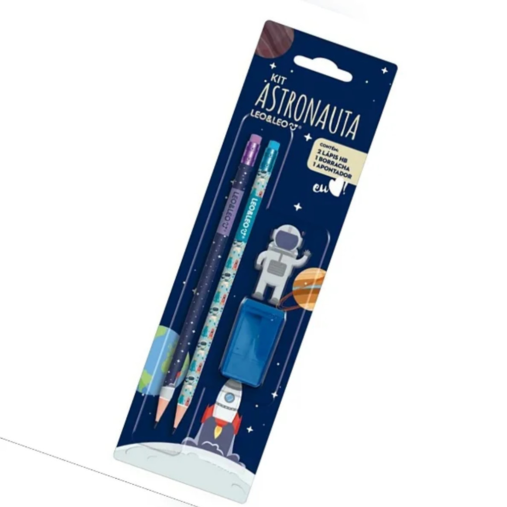 Marca: Leo&Leo; Referência: 72170; Código: 478578; Características do Produto: Kit Lápis HB personalizado com tema, 2 lápis grafite HB formato redondo, 01 apontador, 01 borracha (cores sortidas); Embalagem: Blister com 04 peças kit escolar astronauta