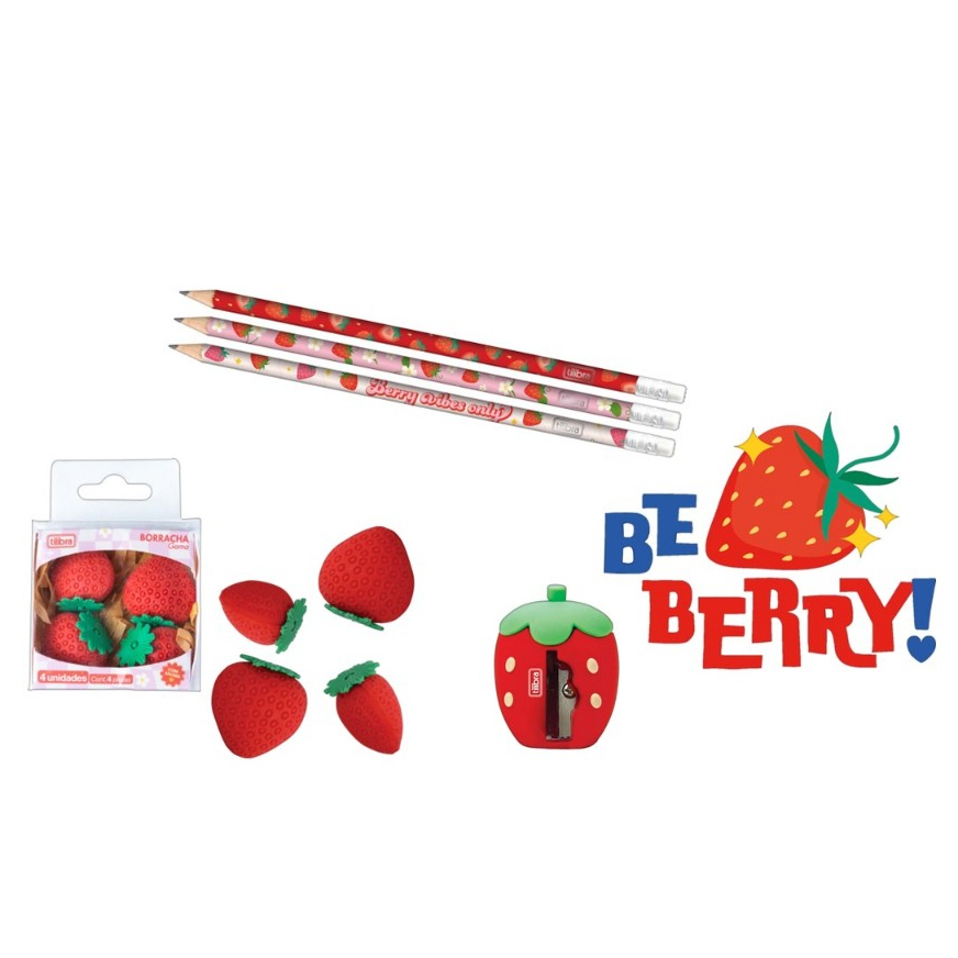 Kit Escolar Be Berry 3 Lápis + 1 Borracha + 1 Apontador Morangos com cheirinho Strawberry Tilibra