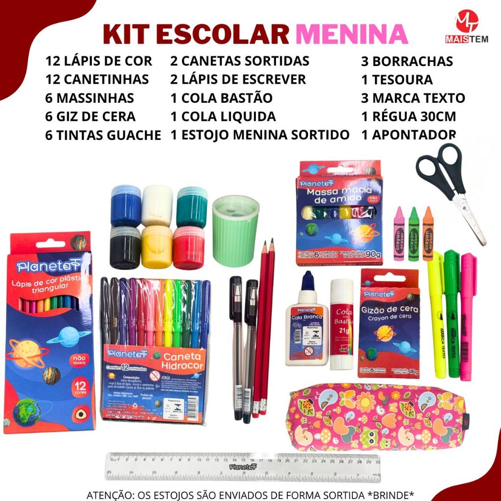 🎒 Kit Escolar Completo – Ideal para o dia a dia na escola! ✏️📚 O Kit Escolar foi pensado para oferecer praticidade, economia e tudo o que a criança precisa para estudar e soltar a criatividade. Completo e funcional, é ideal para uso escolar, atividades em casa e trabalhos manuais. ✨ Conteúdo do Kit: 12 lápis de cor 12 canetinhas 6 massinhas 6 giz de cera 6 tintas guache 2 canetas sortidas 2 lápis de escrever 2 borrachas 1 tesoura 1 cola bastão 1 cola líquida 3 marca-texto 1 régua de 30 cm 1 apontador 1 estojo estampado 🎁 ATENÇÃO: Estojo SORTIDO É possível escolher apenas a opção menino ou menina, porém as estampas são enviadas de forma sortida, de acordo com a disponibilidade em estoque. 🛒 Perfeito para listas escolares, presente ou reposição de materiais. Um kit prático, colorido e cheio de criatividade!