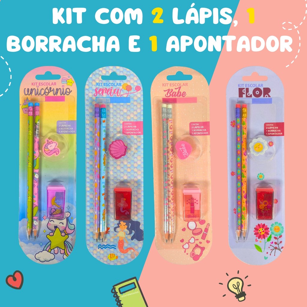 | Kit Escolar Fantasia Fofo Com 2 Lápis HB, Borracha E Apontador este produto | R$ 12,90 | 19% | 5.0/5 | 1 |