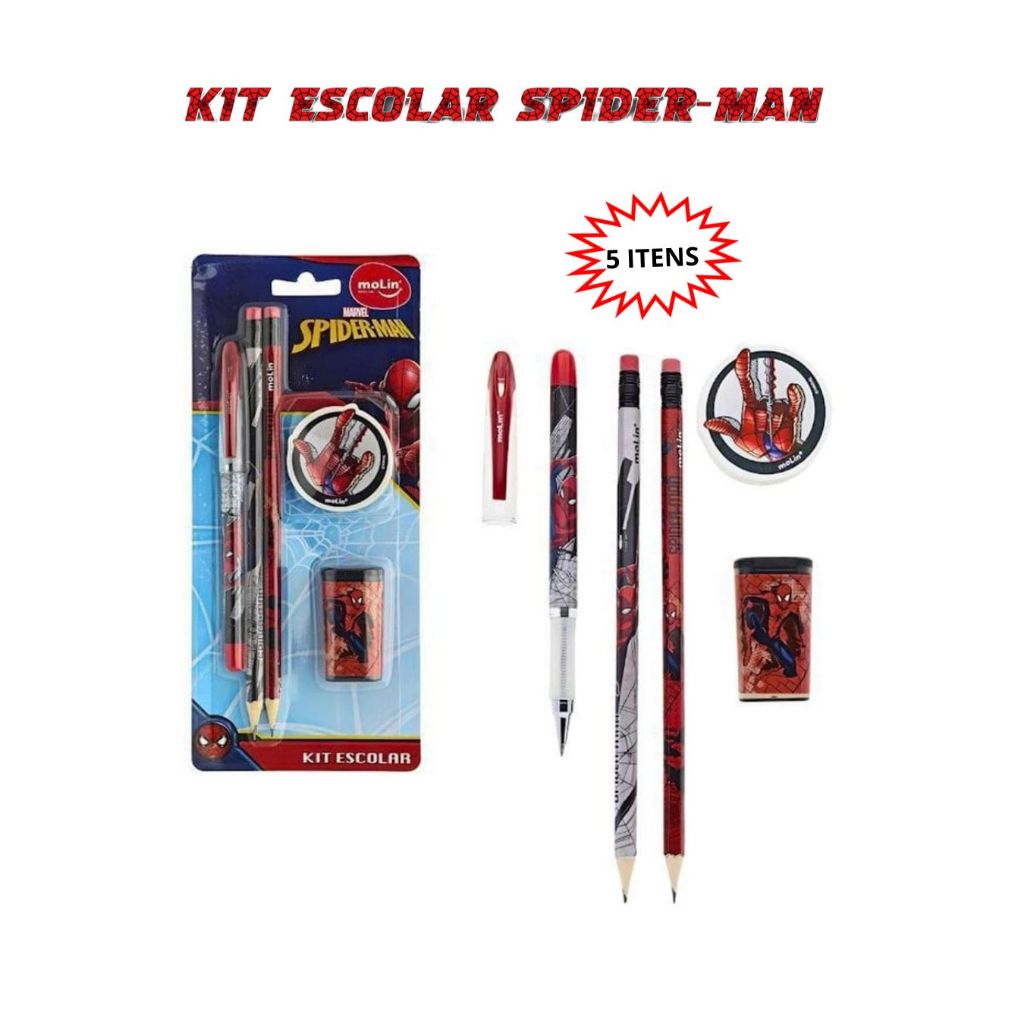 kit escolar infantil homem aranha,caneta,lápis,apontador,caneta e borracha.Voltas às aulas