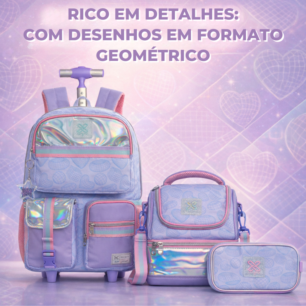 O Kit Escolar Mochila de Rodinhas, Lancheira e Estojo Geométrico é a solução completa para quem busca praticidade, organização e um visual moderno para a rotina escolar. Desenvolvido para atender às necessidades de crianças e adolescentes, o kit reúne três itens essenciais que se complementam, oferecendo funcionalidade, conforto e durabilidade no dia a dia. A mochila com rodinhas possui excelente capacidade interna, ideal para transportar livros, cadernos, pastas e materiais escolares com segurança. Seu design utilitário geométrico é enriquecido por detalhes exclusivos, acabamento em PVC com efeito holográfico e aplicações em candy colors, criando um visual jovem e atual. Acompanha um chaveiro decorativo que adiciona charme e personalidade ao conjunto. Conta com diversos compartimentos internos e bolsos versáteis que facilitam a organização dos pertences, além de bolsos laterais ideais para garrafas de água, guarda-chuvas ou itens de acesso rápido. As alças da mochila são ajustáveis e acolchoadas, proporcionando conforto quando utilizada nas costas. O sistema de carrinho oferece praticidade extra, reduzindo o peso carregado pelo estudante. Fabricado em metal pintado, o carrinho possui travas de altura, duas rodas resistentes e freio frontal, garantindo estabilidade, segurança e facilidade no transporte. A lancheira térmica do kit foi projetada para manter os alimentos organizados e conservados por mais tempo. Seu interior espaçoso conta com dois compartimentos, permitindo separar lanches, bebidas e acessórios de forma prática. O design segue o mesmo padrão geométrico utilitário da mochila, com PVC iridescente e detalhes em candy colors, mantendo a harmonia visual do conjunto. A alça ajustável oferece conforto e facilidade no transporte, sendo ideal para o uso diário escolar ou passeios. O estojo box completa o kit oferecendo amplo espaço para lápis, canetas, borrachas e outros materiais escolares. Possui compartimento com divisória, facilitando a organização e o acesso rápido aos itens. Assim como os demais produtos, apresenta puxadores de zíper personalizados e acabamento em materiais resistentes, garantindo durabilidade e praticidade. Todos os itens do kit são confeccionados em nylon de alta qualidade combinado com PVC iridescente, materiais que oferecem resistência, longa vida útil e fácil limpeza, ideais para o uso intenso da rotina escolar. Dimensões aproximadas: Mochila com rodinhas Largura: 34 cm Altura: 44 cm Comprimento: 13,5 cm Lancheira Largura: 22 cm Altura: 20 cm Comprimento: 18 cm Estojo Largura: 22 cm Altura: 5 cm Comprimento: 14 cm Um kit escolar completo, funcional e com visual diferenciado, ideal para quem deseja unir organização, conforto e estilo em um único conjunto para o dia a dia escolar.