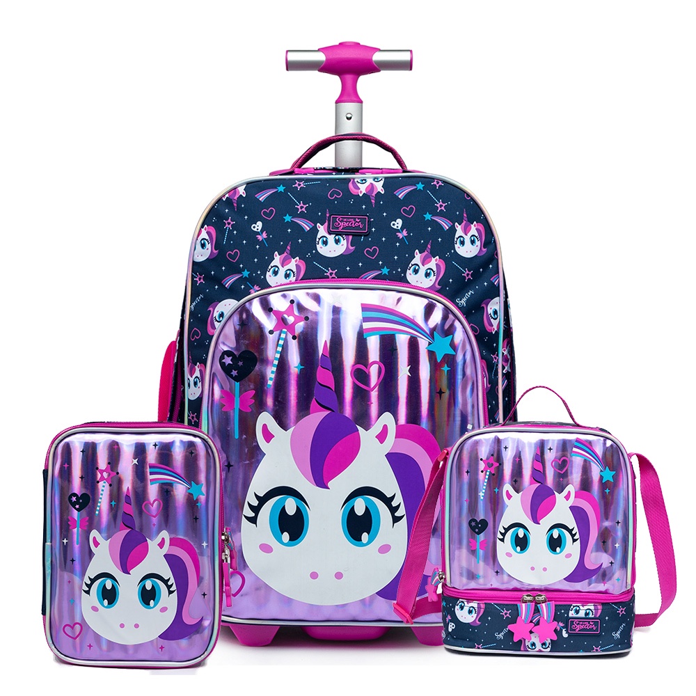 Kit Escolar Mochila Unicórnio Tubarão Escolar Infantil Carrinho Rodinha
