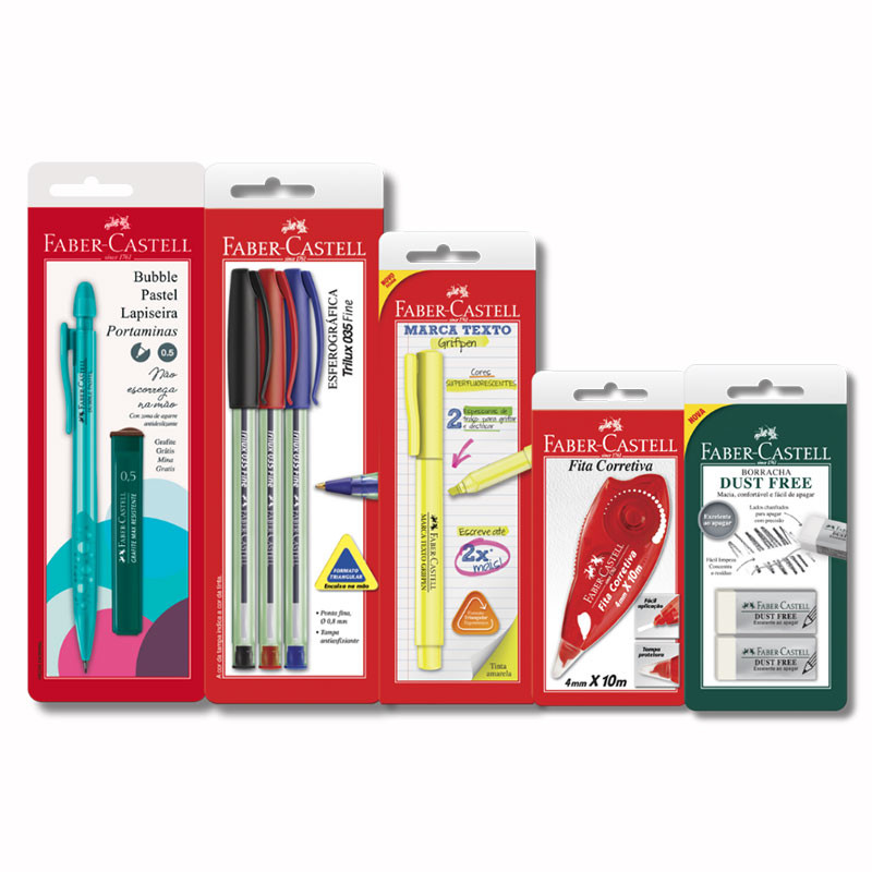 Kit Escolar Rotina de Estudos Faber-Castell Contém: 1 PC Lapiseira 0.5mm Bubble Verde água pastel SM/05BBVA Faber-Castell 1 PC Caneta esferográfica Trilux azul/preto/vermelho 3 unid SM/TRIPF Faber-Castell 1 PC Pincel marca texto amarelo SM/MTAMZF Faber-Castell 1 PC Corretivo em fita Roller SM /7072 4.2mmx10m Faber-Castell 1 PC Borracha Dust Free SM/187137 com 2 unidades Faber-Castell Detalhes: Lapiseira 0.5mm Bubble - Verde água pastel - SM/05BBVA - Faber-Castell Detalhes: - Lapiseira com pega emborrachada - Não escorrega na mão - Blister com 1 lapiseira + 1 tubo de grafite com 12 minas. Caneta esferográfica Trilux azul/preto/vermelho 3 unid SM/TRIPF - Faber-Castell Descrição - A cor da tampa indica a cor da tinta - Escrita macia. - Escrita fina (0.8mm). Pincel marca texto amarelo - SM/MTAMZF - Faber-Castell O Marca Texto Grifpen da Faber-Castell possui a ponta chanfrada, que possibilita traços finos e grossos a depender da posição que a ponta é colocada no papel. Seu formato triangular garante maior conforto ao escrever e as cores são superfluorescentes. Ah, a tinta não passa para o outro lado da folha viu? Corretivo em fita Roller - SM /7072 - 4.2mmx10m - Faber-Castell Descrição - Secagem imediata: não é necessário esperar para corrigir. - Fácil aplicação. - Tampa protetora. Borracha Dust Free SM/187137 com 2 unidades - Faber-Castell Detalhes - Excelente ao apagar. - Lados chanfrados para apagar com precisão. - Com tecnologia Dust Free: concentra o resíduo para limpeza fácil.