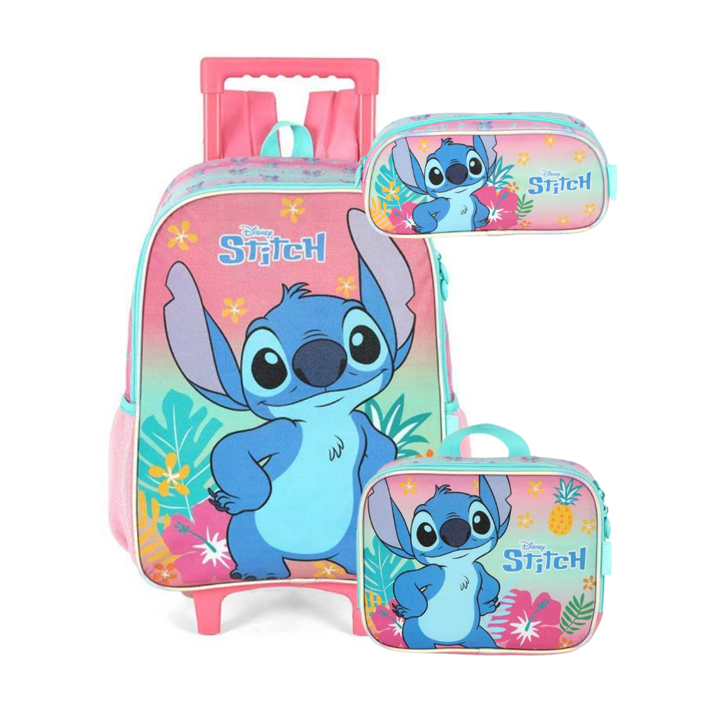 Kit Escolar Stitch Luxcel – Mochila de Rodinhas + Lancheira Térmica + Estojo com Glitter