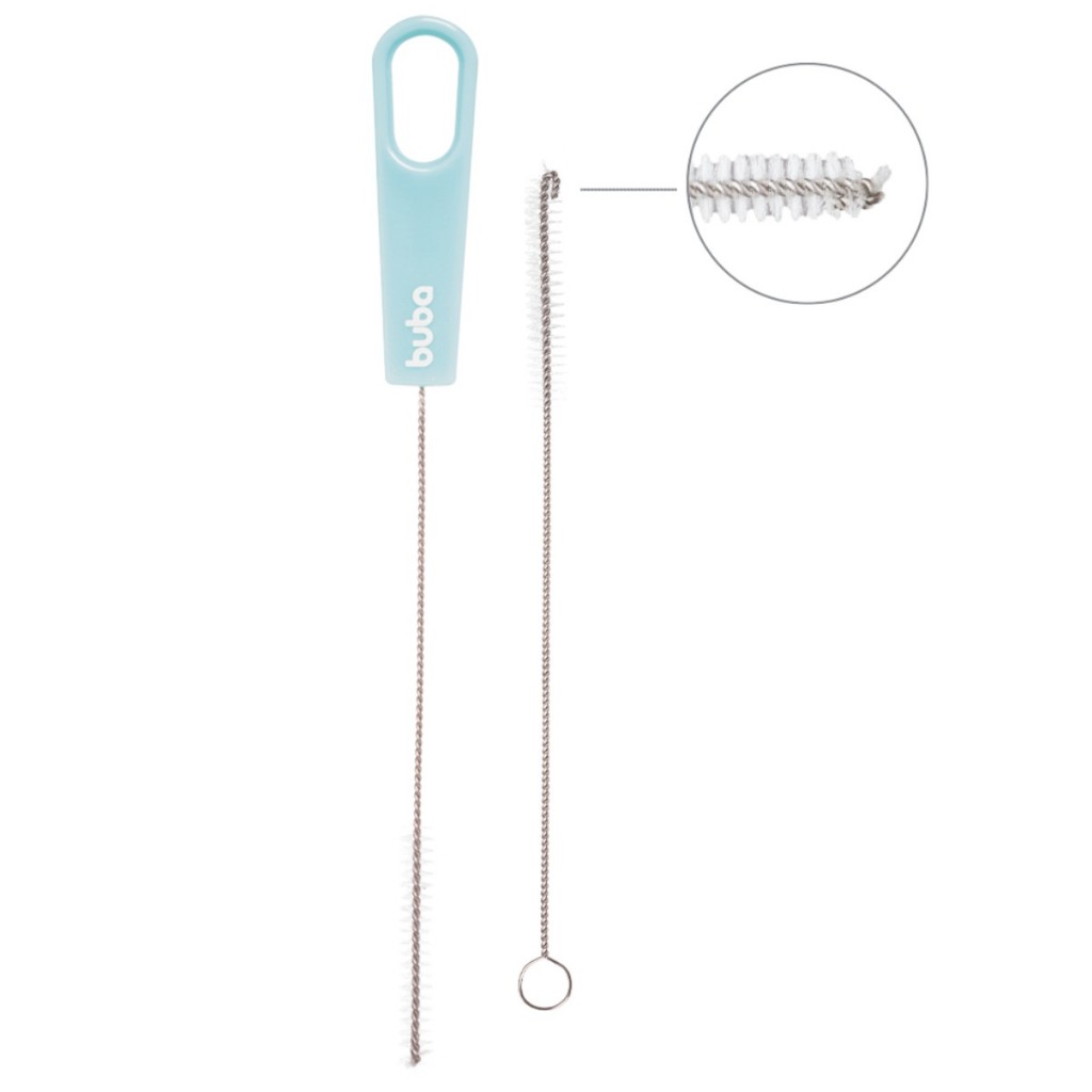 Para uma limpeza mais prática e eficiente! O Kit Escovas da Buba é ideal para lavar canudos, pois atinge áreas difíceis de serem alcançadas. Ela possui cerdas macias, duráveis e é compatível com todos os modelos de canudo. Especificações: - Contém: 2 unidades (1 com cabo plástico e 1 com cabo metálico) - Livre de BPA e Ftalatos - Produto 100% atóxico - Composição: Cabo: 100% Polipropileno (PP), Escova: 100% Aço - Medidas: Escova G: 17 x 1,5 x 0,5 (AxLxP) cm Escova P: 14 x 0,8 x 0,8 (AxLxP) cm Recomendações: Lave bem o produto antes do primeiro uso com água corrente e sabão neutro. Manter em local seco, longe do alcance do sol. Este produto poderá apresentar variação de cores e detalhes. Este produto não e um brinquedo, manter fora do alcance de crianças.