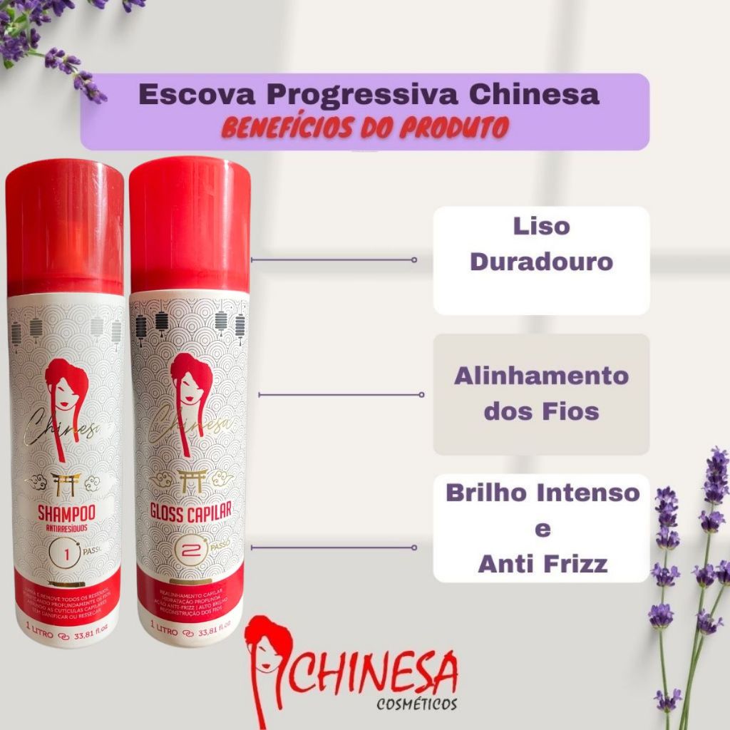 Chinesa Escova Progressiva 2x1Litro é um tratamento de reestruturação e realinhamento térmico capilar. Chinesa Escova Progressiva contém Óleos resinosos com ação emoliente e anti-frizz que atuam como agentes redutores de volume e proporcionam o realinhamento da superfície capilar, conferindo aos cabelos um efeito temporariamente liso e disciplinado. Chinesa Escova Progressiva possui Extrato de Canela da China que aumenta o brilho dos cabelos, Mirra que equilibra a oleosidade e a queda dos fios, Oliva que potencializa o efeito de hidratação e Óleo de Cálamo que forma um filme protetor para a selagem da cutícula, conservando assim o realinhamento dos fios. Chinesa Escova Progressiva é um tratamento que proporciona cabelos sem frizz e perfeitamente lisos. Com os produtos da linha, o profissional cabeleireiro realiza o serviço de realinhamento térmico que promove a reparação capilar de dentro para fora e ajuda a transformar os fios danificados em cabelos lisos, brilhantes e totalmente alinhados. Chinesa Escova Progressiva proporciona cabelos profundamente restaurados, luminosos e macios. Chinesa Escova Progressiva possui alto poder hidratante e atinge alto nivel redução de volume dependendo do tipo de cabelo em que é aplicado. Seu pH balanceado proporciona melhor resultado. Chinesa Escova Progressiva transforma cabelos volumosos e com frizz em cabelos com brilho, sedosos e sem volume. Chinesa Escova Progressiva é compatível com todo e qualquer processo químico, onde os cabelos podem ser lavados imediatamente após sua aplicação. Conselho de aplicação Para Cabelos Grossos: - Lavar os cabelos com Shampoo de limpeza profunda; - Secar de 70% Aplicar a Progressiva mecha a mecha com o auxilio de um pincel e pente fino da nuca até a parte da franja; - Aguardar 40 minutos; - Enxaguar para retirar o excesso; - Secar e pranchar ou escovar e pranchar; - A durabilidade do efeito disciplinado é de dois meses dependendo da porosidade dos fios. Para Cabelos Finos: - Lavar os cabelos com Shampoo de limpeza profunda; - Secar de 90% Aplicar a Progressiva mecha a mecha com o auxilio de um pincel e pente fino da nuca até a parte da franja; - Aguardar 25 a 30 minutos; - Enxaguar para retirar o excesso; - Secar e pranchar ou escovar e pranchar; - A durabilidade do efeito disciplinado é de dois meses dependendo da porosidade dos fios. Precauções: - Este serviço deve ser feito por um profissional cabeleireiro que conheça e trabalhe com os produtos Chinesa; - não se deve utilizar o produto caso o cliente apresente o couro cabeludo sensível, irritado ou ferido; - A loja não se responsabiliza pelo mau uso, ou uso indevido dos produtos. Leia atentamente as instruções antes da utilização, sendo que a loja recomenda que o serviço seja feito por um profissional cabeleireiro que conheça e trabalhe com os produtos Chinesa. CONTEÚDO 1 SHAMPOO LIMPEZA 1LITRO 1 ATIVO REDUTOR 1 LITRO