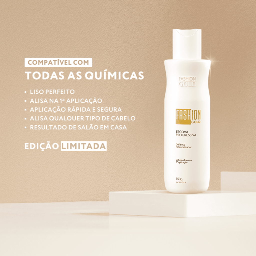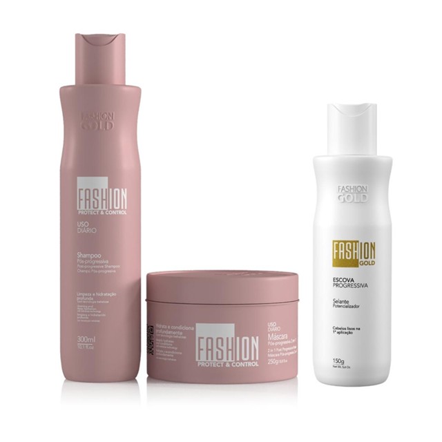 Você encontrou a solução para alisar os seus cabelos de forma segura, sem precisar se preocupar com o mau odor ou se irá danificar o seu cabelo. A Escova Progressiva Fashion Gold proporciona cabelos totalmente alinhados, com brilho espelhado e sem frizz. É a solução perfeita para você que quer estar com os cabelos bonitos e alinhados a qualquer hora do dia. A Fashion Gold foi a primeira progressiva que entregou resultados de salão em casa de forma acessível, prática e sem danificar os seus fios, com resultado garantido por até 90 dias. Você não precisa se preocupar com o medo de afinar os fios, com cheiro forte, ardência ou casquinhas no couro cabeludo ao usar nossa Escova Progressiva. A fórmula exclusiva da Fashion Gold foi desenvolvida para alisar os seus cabelos desde a primeira aplicação, mantendo-os resistentes e saudáveis, com o ativo exclusivo Kerafive22® e ingredientes de alta qualidade, como a proteína de quinoa, o óleo Inca e o óleo de coco, que nutrem profundamente seus fios, reduzindo a quebra e o frizz, deixando seus cabelos brilhantes e macios. Tenha cabelos lisos, saudáveis e deslumbrantes com a Progressiva Fashion Gold. Shampoo Protect Control 300ml - Fashion Gold Agora é possível ter um cabelo liso e saudável por muito mais tempo! O SHAMPOO PÓS PROGRESSIVA FASHION GOLD prolonga o efeito do alisamento e preserva o brilho e a hidratação natural dos fios. Um shampoo convencional tende a retirar até 5x mais rápido o efeito do alisamento, além de deixar o cabelo ressecado e sem brilho. Já o SHAMPOO FASHION GOLD foi elaborado com a mais alta tecnologia para manter as escamas do cabelo (cutículas capilares) fechadas, evitando a oxidação e perda dos ativos que mantém o cabelo liso e nutrido. Sua exclusiva formulação limpa sem danificar os fios, promovendo uma hidratação profunda e tratamento intenso. Sua fórmula concentrada proporciona maior rendimento, possibilitando um número muito maior de lavagens do que outros shampoos tradicionais. Recomendado para todo o tipo de cabelo e compatível com todas as químicas do mercado. Não altera a cor dos fios. Pode ser usado diariamente. Especialmente indicado para quem usa a Escova Progressiva FASHION GOLD. Este produto não alisa o cabelo, apenas prolonga o efeito obtido com a escova progressiva. PH: 7,0 Máscara 2 em 1 Pós-Progressiva Fashion Gold 250g Realize o sonho do cabelo liso e altamente hidratado, com brilho intenso e naturalidade! A MÁSCARA 2 EM 1 é capaz de condicionar e hidratar ao mesmo tempo. Proporcionando um efeito único, deixando seu cabelo com balanço e naturalidade. Sua exclusiva tecnologia prolonga o efeito obtido pela escova progressiva, deixando o cabelo liso por muito mais tempo. Dispensa o uso de condicionador, pois seu pH equilibrado hidrata ao mesmo tempo que mantém a cutícula dos fios fechadas, preservando o alisamento por muito mais tempo. Pode ser usada diariamente. Não aumenta a oleosidade natural dos fios e não deixa o aspecto de pesado. Promove um alinhamento nos fios, diminuindo o frizz e facilitando o penteado após a lavagem. Recomendado para todo o tipo de cabelo. Pode ainda servir como máscara de hidratação profunda, se usado em conjunto com uma touca térmica, deixando agir por 10 a 25 minutos. Especialmente indicado para quem usa a Escova Progressiva FASHION GOLD. Este produto não alisa o cabelo, apenas prolonga o efeito obtido com a escova progressiva. PH: 4,5 Modo de Uso Passo 1: Lave os cabelos com um shampoo de sua preferência (recomendamos o Shampoo Pós-Progressiva da linha Protect e Control), massageando até formar uma espuma abundante. Enxágue e, se necessário, repita o procedimento Passo 2: Seque 80% do cabelo com auxílio de uma toalha ou secador. Passo 3: Aplique o Selante Potencializador mecha a mecha, com auxílio de um pincel, respeitando a distância de 0,5 cm do couro cabeludo. Passo 4: Deixe agir por 60 minutos com o auxílio de uma touca. Passo 5: Enxágue bem os fios, retirando completamente o produto. Passo 6: Seque bem os cabelos com a ajuda de um secador. Passo 7: Pranche mechas finas, de 15 a 20 vezes, utilizando uma chapinha entre 180ºC e 200ºC. Itens Inclusos 01 - Escova Progressiva 150g - Fashion Gold 01 - Shampoo Pós Progressiva 300ml - Fashion Gold 01 - Máscara 2 em 1 Pós Progressiva 250g - Fashion Gold