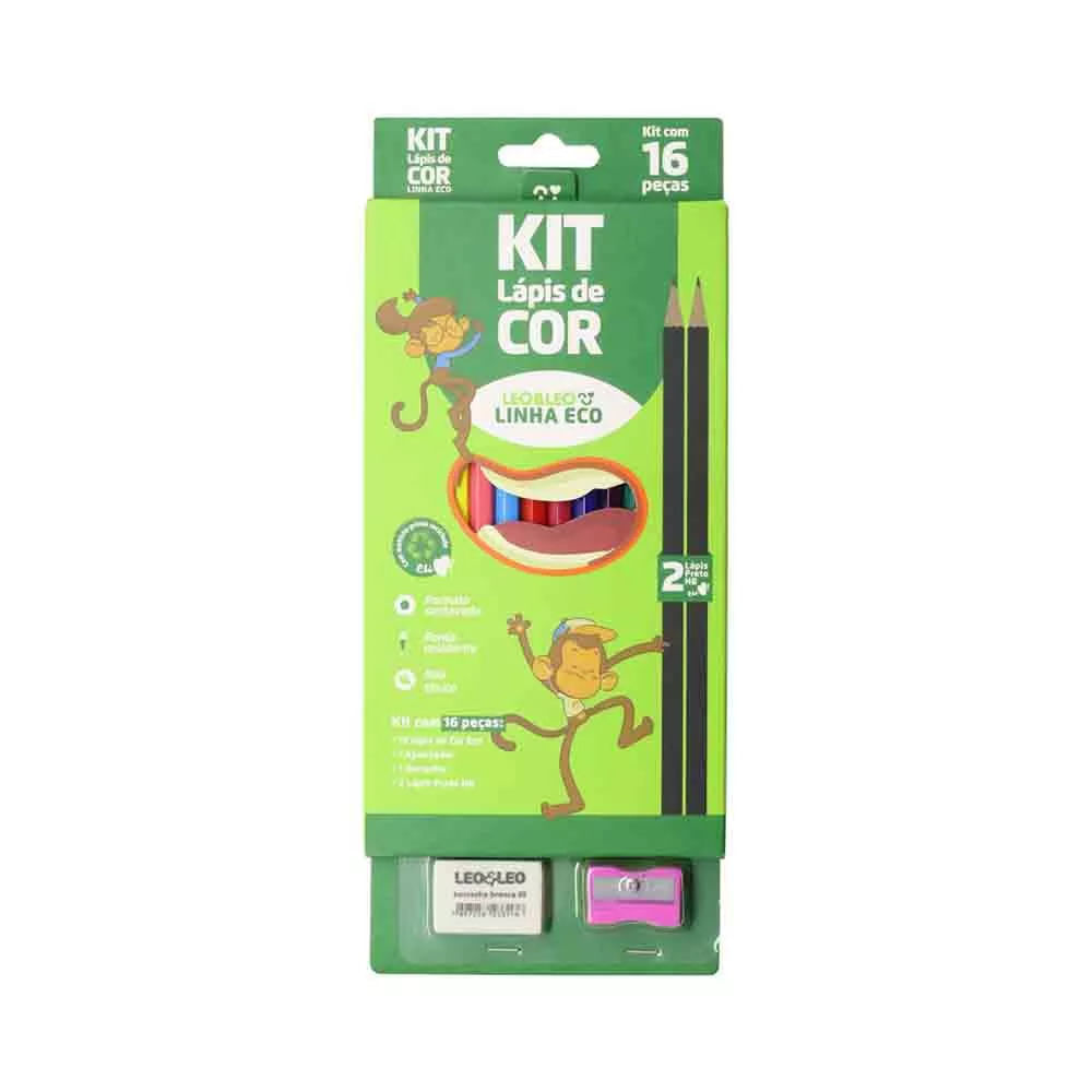 Kit Escrita Leonora Ecológico 12 Lápis de Cores + 2 Lápis Grafites HB + 1 Borracha + 1 Apontador