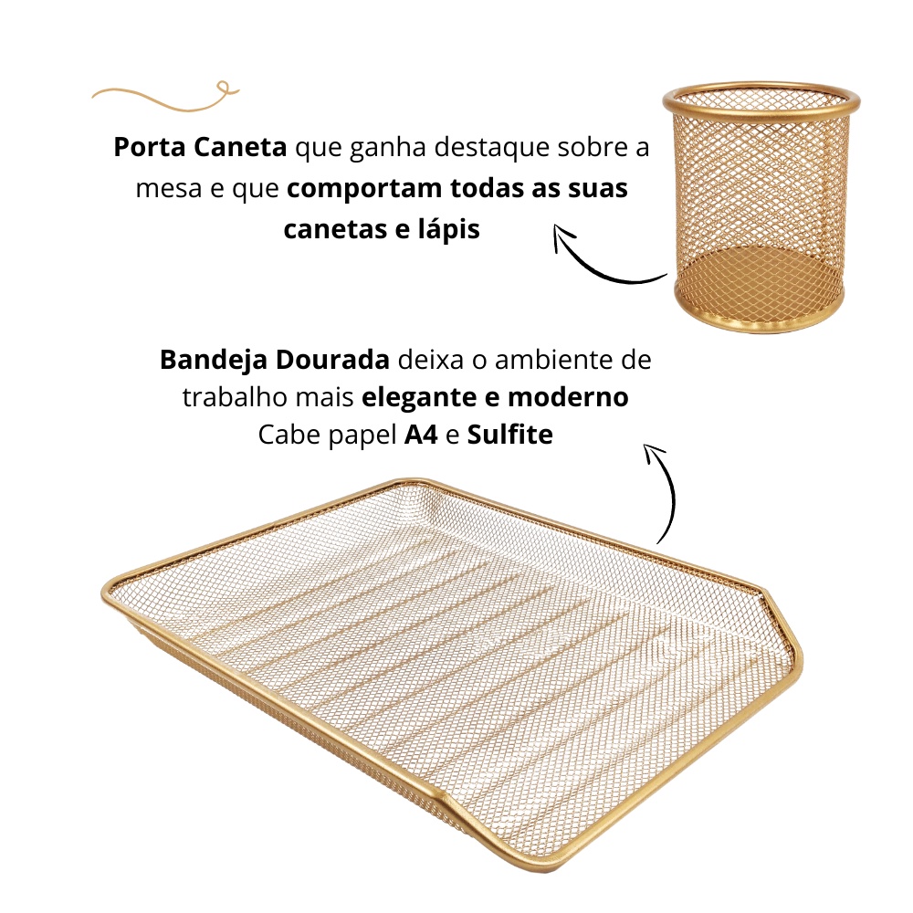 Kit Escritório Lixeira Organizador de Mesa Bandeja Organizadora Porta Caneta Dourado
