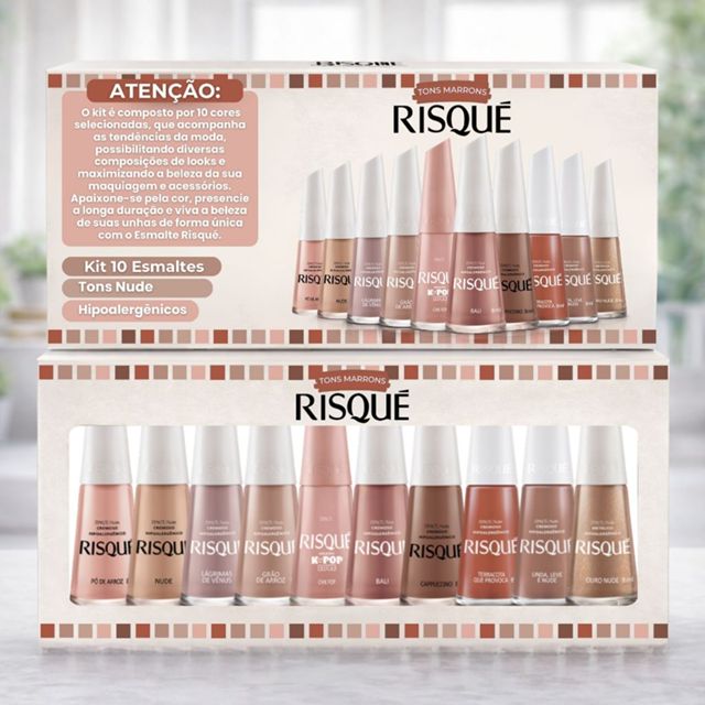 | Kit Esmalte Risque Atacado Manicure 10 Cores Tons Nude + Box Person... este produto | R$ 64,90 | 32% | 5.0/5 | — |
