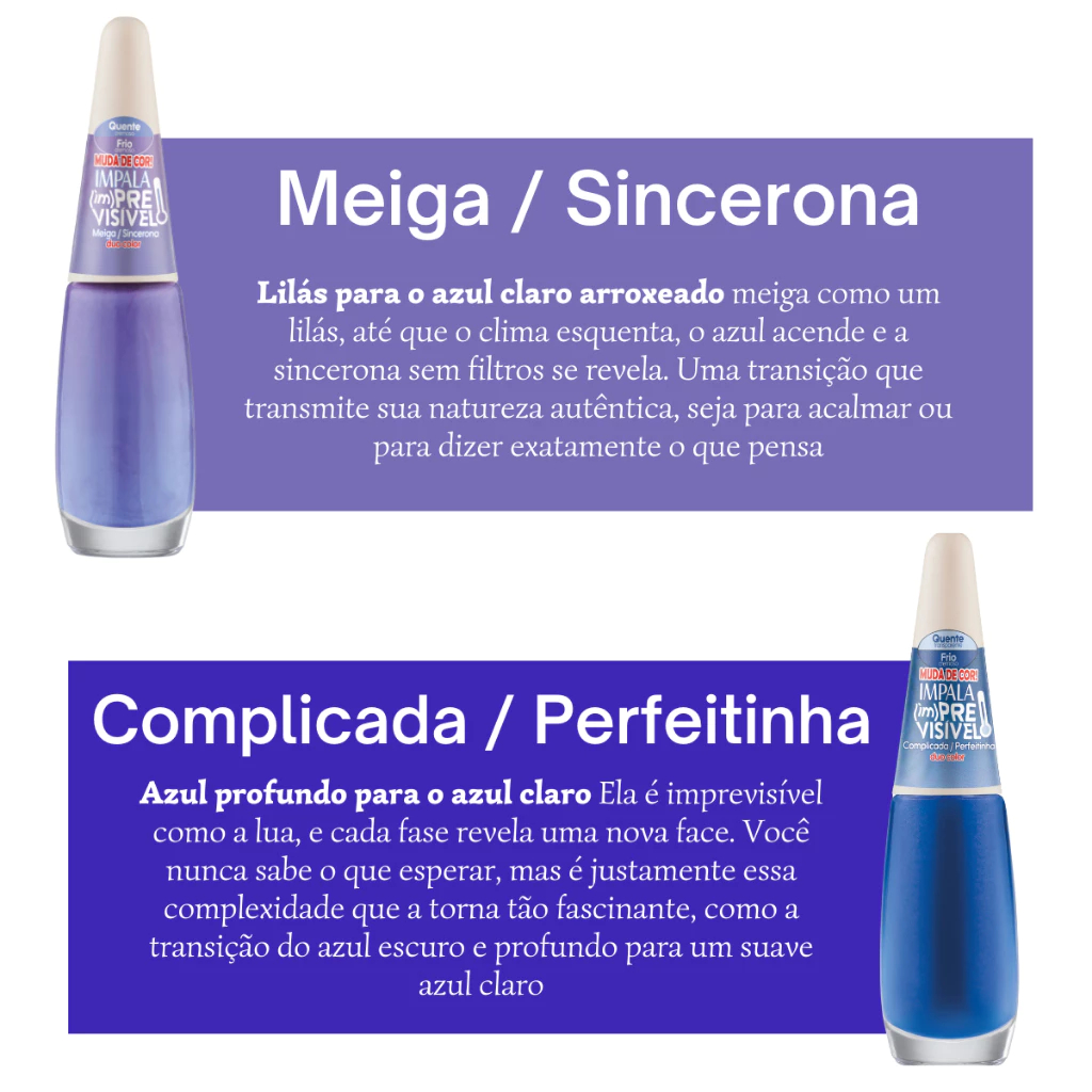 KIT ESMALTES IMPALA COLEÇÃO IMPREVISÍVEL DUO COLOR Escolha o kit com as cores que deseja. Esmaltes Duo Color: Os esmaltes duo color são uma tecnologia inovadora para o mercado brasileiro de cosméticos. Possuem pigmentos sensíveis á temperatura, que criam uma experiência visual única ao mudar com o calor do corpo e do ambiente. É como se cada cor escondesse uma surpresa , revelando novas tonalidades ao longo do dia, de acordo com as variações térmicas. Prepare-se para uma experiência que vai além do convencional, trazendo para suas unhas uma novidade que é ao mesmo tempo, surpreendente e encantadora Somos uma mistura fascinante de contrastes, de opostos que se misturam, de extremos que convivem em uma harmonia caótica. Em um momento, você é a meiga que acalma as tempestades, no outro, a sincerona que as provoca. O que acontece quando você combina essas dualidades em um único frasco? Apresentamos a coleção (im)Previsível - Uma linha de esmaltes que mudam de cor conforme a temperatura, refletindo as muitas camadas da sua personalidade em contrastes inesperados. De Tímida Biscoiteira a Complicada Perfeitinha, cada esmalte traduz suas diferentes faces, adaptando-se ao que o momento exige Com tecnologia duo color, a transformação de cores é mais do que um efeito visual; é a demostração da sua versatilidade, da sua capacidade de variar entre diferentes versões de si mesma Com (im)Previsível, cada cor esconde uma surpresa, cada mudança é uma nova expressão. E, no fim não se trata de escolher lados - trata-se de explorar a mistura deles! AS CORES DOS KITS SÃO AS SEGUINTES: - Esmalte Complicada / Perfeitinha - Esmalte Tranquila / Surtada - Esmalte Meiga / Sincerona - Esmalte Realista / Fanfiqueira - Esmalte Tímida / Biscoiteira - Esmalte Emocionada / Desapegada - Esmalte Desenrolada / Misteriosa - Esmalte Glamurosa / Basiquinha