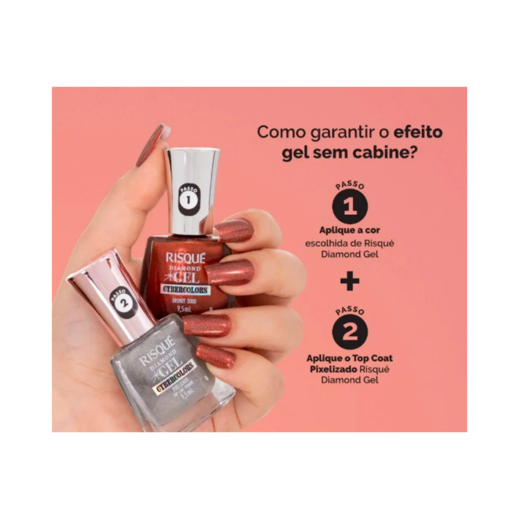 A nova coleção Risqué Diamond Gel Cybercolors conta com 6 esmaltes: Brilho de Vênus, Bronze 3000, Chuva Cósmica, Metrópole Noturna, Espelho do Amanhã, Euforia Lilá. E 1 Top Coat Fixador Efeito Holográfico Pixelizado. Os esmaltes possuem secagem rápida e ultra brilho. Desenvolvidos especialmente para proporcionar durabilidade, os esmaltes contam com um pincel de 880 cerdas, que além de facilitar a esmaltação, proporciona aplicação uniforme. Com fórmula hipoalergênica, sendo livre de substâncias que podem causar alergia. Para obter o efeito gel, aplique o esmalte com cor Risqué Diamond Gel Cybercolors escolhido (passo 1) e em seguida aplique o Top Coat Fixador Risqué Diamond Gel Pixelizado (passo 2), garantindo efeito gel sem precisar de cabine UV. Risqué é contra testes em animais! Todos os produtos Risqué são aprovados pelo programa Leaping Bunny da Cruelty Free International, padrão ouro globalmente reconhecido para produtos livre de crueldade animal. Brilhe como o amanhã! Conheça toda a coleção Risqué Diamond Gel Cybercolors: o poder do amanhã está no agora.