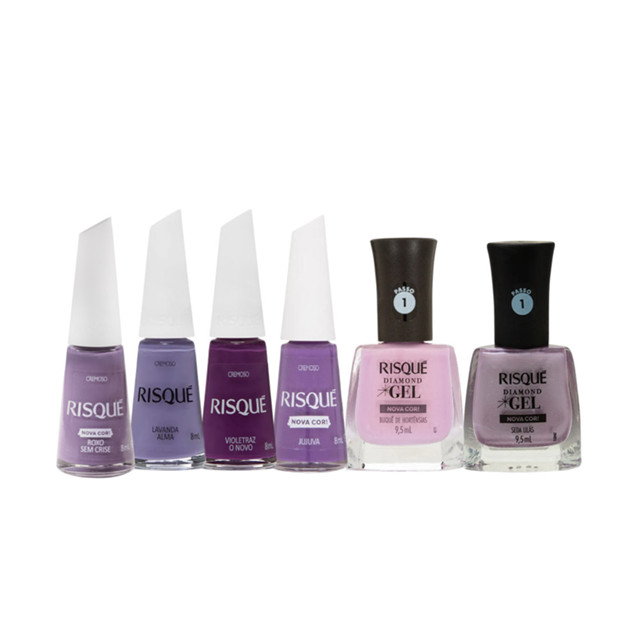 O kit de esmaltes Risqué Roxos Cósmicos possui 6 esmaltes: Roxo Sem Crise, Lavanda Alma, Violetraz o Novo, Jujuva, Buquê de Hortênsias e Seda Lilás. Os esmaltes possuem secagem rápida e ultra brilho. Além disso, possuem longa duração e fórmula hipoalergênica, sendo livres de componentes que costumam causar alergias. Todos os produtos Risqué são aprovados pelo programa Leaping Bunny da Cruelty Free International, padrão ouro globalmente reconhecido para produtos livres de crueldade animal. Este kit é perfeito para quem curte tons de roxo, do mais delicado até o mais intenso, com muita autenticidade. Toda a linha de esmaltes Risqué apresenta textura única, cores elegantes e acompanha as tendências da moda, possibilitando diversas composições de looks e maximizando a beleza da sua maquiagem e acessórios.