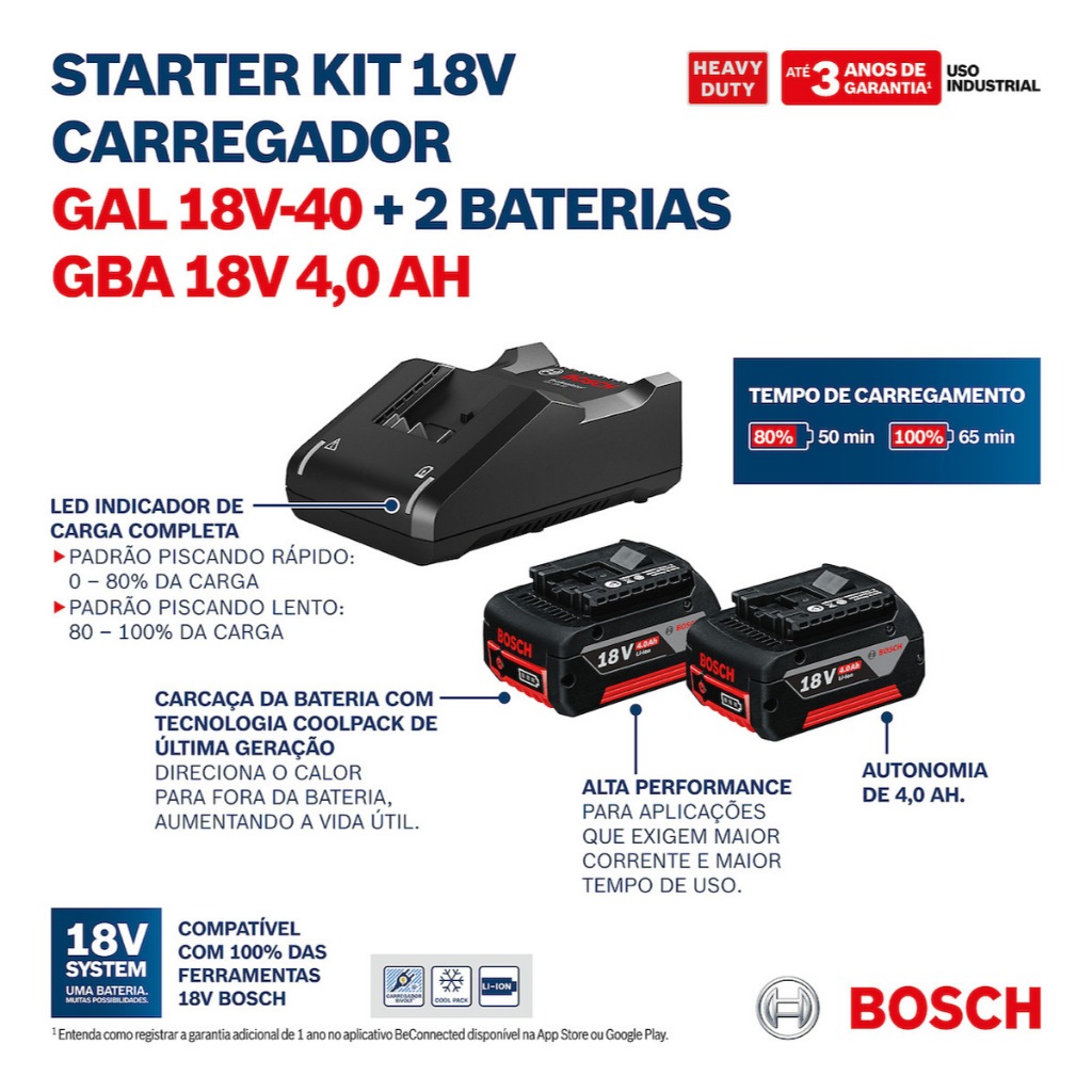 Kit Esmerilhadeira Bosch GWS 18V-10 + 2 Bateria e Carregador Descrição Esmerilhadeira Angular a Bateria de 5" Bosch GWS 18V-10 Vantagens: - A Esmerilhadeira Angular a Bateria de 5" Bosch GWS 18V-10, 18V, com motor sem escovas de carvão, possui potência equivalente a uma ferramenta com fio de 1.000W; - Garantida máxima proteção ao profissional com tecnologia que desliga a ferramenta em caso de queda e em caso de travamento do acessório, o motor para automaticamente evitando risco ao operador; - Além disso, só alcança sua rotação máxima 2-3 segundos após acionada e parada mais rápida do disco após 2 segundos do desacionamento do gatilho garante maior segurança do profissional; - Vem com motor sem escovas de carvão livre de manutenção, com o dobro de vida útil e maior autonomia; - Compatível com 100% das baterias e carregadores 18V Bosch; - Uso industrial com 2 anos de garantia. Características: - Equipamento Bosch Heavy Duty; - Equipamento rolamentado; - Não possui velocidade variável; - Não possui controle de torque; - Não possui fonte de luz; - Acabamento da ferramenta: Poliamida, metal e elastômero; - Acabamento do cabo: Borracha, cobre; - Tipo de embalagem: Caixa de papelão; - Uso indicado: Corte e desbaste em todo tipo de metal; - Público Alvo: Industrias Metalmecânica. Dados Técnicos: - Voltagem da bateria: 18 V; - N° de rotações em vazio: 9.000 r.p.m.; - Rosca do eixo de esmerilhamento: M14; - Disco de esmerilhamento/corte, diâmetro: 125 mm - 5'; - Dimensões do produto (AxLxP): 11x30x35,8 cm; - Peso sem bateria: 2,1 kg. Valores totais de vibração (Desbastar superfícies (ásperas): - Valor de emissão de vibrações ah: 6,7 m/s²; - Incerteza K: 1,5 m/s². Valores totais de vibração (Lixar com folha de lixa): - Valor de emissão de vibrações ah: 1,9 m/s²; - Incerteza K: 1,5 m/s². Kit de 2 Baterias GBA 18V 4Ah + Carregador de baterias Bosch GAL 18V-40 Bivolt Vantagens: - As baterias GBA 18V 4,0 Ah possuem células de íons de lítio, que não causam efeito memória e não descarregam quando estão em repouso; - Proporcionam uma elevado tempo de uso com uma mesma carga, trazendo mais autonomia para o trabalho; - Além disso, vem com um sistema exclusivo de temperatura Coolpack, que mantém o interior da bateria refrigerado, aumentando a vida útil; - Fabricado com materiais flexíveis, é ideal para absorver o impacto em caso de queda; - O carregador de baterias rápido Bosch GAL 18V-40, de 18V e bivolt é compatível com 100% das Baterias 18V Bosch; - Oferece trabalho contínuo mais eficiente com corrente de saída de 4Ah; - Possui led indicador de carga completa, além de indicação de falhas e superaquecimento; - Comprimento do cabo de 1,5 metros para maior alcance na execução do trabalho; - Carrega a bateria de 4,0 Ah a 80% em 48 min e a 100% em 65 min; - Garantia 2 anos Bosch. Características: - Equipamento Bosch Heavy Duty; - Tempo de carga (min): 48/65; - Tipo de embalagem: Caixa de papelão; - Acabamento da ferramenta: Poliamida e elastômero; - Acabamento do cabo: Borracha e cobre (carregador); - Comprimento do cabo: 1,5 m; - Público Alvo: Usuários de ferramentas a bateria Bosch 18V. Dados Técnicos: - Fonte de energia: bateria bivolt; - Voltagem da bateria: 18V; - Amperagem: 4 ah; - Composição da célula da bateria: Íons de Lítio; - Número de Células de íons de lítio: 10; - Conteúdo da bateria de íons de lítio: 72; - Peso da bateria: 0,619 kg; - Peso do carregador: 0,55 kg. Componentes inclusos no kit: - 1 Esmerilhadeira Angular GWS 18V-10; - 1 Porca de apoio; - 1 Porca de aperto rápido; - 1 Punho auxiliar; - 1 Capa de proteção; - 2 baterias GBA 18V 4,0 Ah; - 1 carregador GAL 18V-40 Bivolt.