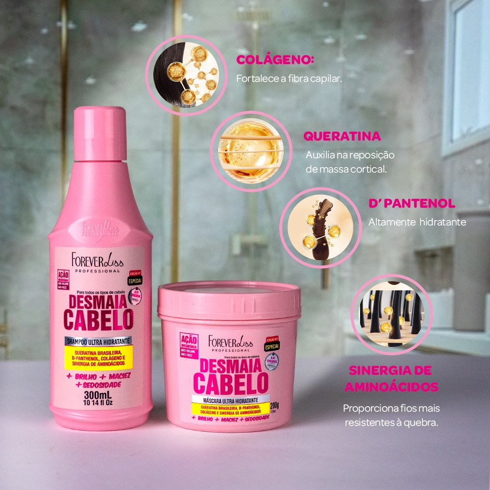 O Kit Especial Desmaia Cabelo Forever Liss com Shampoo 300ml e Máscara 200g é a solução ideal para recuperar a beleza dos seus cabelos, mantendo-os hidratados, alinhados e extremamente macios. O Shampoo Desmaia Cabelo limpa os cabelos delicadamente, hidratando e recuperando os fios porosos, que consequentemente terão seu volume reduzido. A Máscara Desmaia Cabelo Forever Liss, por sua vez, nutre da raiz às pontas, recuperando os cabelos ressecados e sem vida. Para um melhor resultado utilize a linha completa Linha Desmaia Cabelo. Indicação: Indicado para todos os tipos de cabelos, principalmente os ressecados, com frizz e volume em excesso. Modo de uso: 01. Comece a lavagem com o Shampoo Desmaia Cabelo massageando a primeira vez, para retirar resíduos que não permitem a completa formação da espuma; 02. Enxágue e repita a aplicação do Shampoo Desmaia Cabelo, em movimentos circulares suaves, com as pontas dos dedos no couro cabeludo. Aguarde cerca de 3 minutos para que o produto possa penetrar nos cabelos; 03. Enxágue bastante até remover completamente o shampoo; 04. Após lavar, aplique a Máscara Desmaia Cabelo nos fios ainda úmidos, espalhando em todo o comprimento; 05. Enluve mecha a mecha; 06. Deixar agir por 5 minutos; 07. Enxaguar normalmente até remover o produto por completo. Contém: 01 – Shampoo Desmaia Cabelo 300ml 01 – Máscara Desmaia Cabelo 200g Precauções: Manter em temperatura ambiente, em local seco e ao abrigo de luz. Uso externo adulto. Em caso de contato acidental com os olhos, enxaguar abundantemente. Havendo irritação, suspenda o uso. Caso a irritação persista, procure orientação médica. Não ingerir. Manter fora do alcance de crianças. Principais Dúvidas: 01. Qual o pH dos produtos do Kit Especial Desmaia Cabelo Forever Liss? R. O pH dos produtos do Kit Desmaia Cabelo são: Shampoo Desmaia Cabelo: 4,5 - 5,5. Máscara Desmaia Cabelo: 3,8 - 5,2. 02. A Máscara Desmaia Cabelo entra em qual etapa do cronograma capilar? R. Ela entra na etapa de hidro reconstrução. 03. Gestantes, lactantes e crianças podem utilizar? R. Sim. O Kit Especial Desmaia Cabelo Forever Liss com Shampoo 300ml e Máscara 200g não tem contraindicação de uso. 04. Quem tem progressiva pode utilizar o Kit Especial Desmaia Cabelo Forever Liss com Shampoo 300ml e Máscara 200g? R. Sim. Os produtos deste kit são compatíveis com todos os tipos de química.