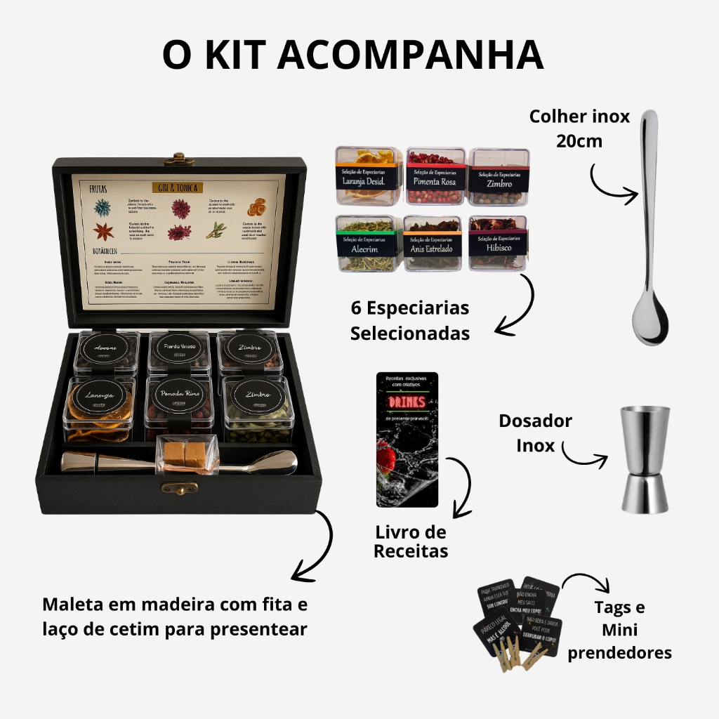 O Kit Contém: 01 Maleta em MDF Premium. Medidas: 20x18x6cm 06 Especiarias Selecionadas e Importadas (anis estrelado, alecrim, flor de hibisco, laranja desidratada, pimenta rosa e zimbro) 01 Dosador duplo em inox 01 Colher em inox 20cm Tags e mini prendedores para decorar sua taça 01 Encarte com dicas de preparo e receitas Presente Exclusivo: Você ainda recebe de presente um EBOOK DIGITAL com RECEITAS exclusivas, desenvolvido pela Roberta Decorações, com uma seleção especial de drinks para surpreender em qualquer ocasião. PERSONALIZAÇÃO COM A SUA LOGOMARCA: Consulte condições: - Acima de 10 unidades. - Comprando diretamente conosco. Quer mais? Temos Kits para Gin, Whisky, Tequila, Amarula, Baileys, Cachaças, Vinho, Espumantes e muito mais.