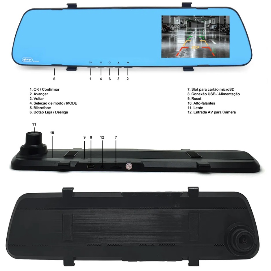 Estacionar com segurança, ter ótima visibilidade traseira e gravar tudo que se passa no trânsito à frente? Esse produto 3 em 1 trás todas as possibilidades! A tela LCD é facilmente instalada sobre qualquer tipo de retrovisor interno e facilmente alimentada pelo acendedor de cigarros e passa a funcionar como uma verdadeira tela multimídia. Na parte traseira da tela há uma câmera de gravação com ajuste para melhor ângulo de imagens, que é exibida em uma área de 4,3 polegadas do espelho e/ou gravada no cartão de memória (não incluso, do tipo MicroSD). Ao acionar a câmera de ré, mesmo que em ambiente sem iluminação, uma imagem de ótima qualidade é exibida, pois há 4 poderosos led para auxiliar a função de visão noturna da câmera, e a imagem se sobrepõe ao espelho em sua porção direita, permitindo ao mesmo tempo visão por ele e visualização da imagem projetada, facilitando muito as manobras. Características Técnicas * Marca KNUP * Modelo KP-S103 * Sistema Fotocrômico * Sensor: Cmos * Angulo de Visão Frontal 170 graus * Angulo de Visão Traseira 120 graus * Formato de Video: Avi/ 30Fps * Formato da foto: Jpeg * Cartão de memória: MicroSD ( Max. 32Gb) * Conexão: Mini Usb/ 12V * Saida de Sinal: Ntsc / Pal * Alimentação: 12V * Bateria: 3Vdc/ 250mAH * Tempo de Recarga Aprox: 2 Horas * Dimensões: 300x74x12mm (L X A X C) * Resolução de Imagem: 720p 1280x720 1080p: 1920x1080 Vga: 640x480 * LCD: 4,3 TFT HD * Resolução Lcd: 480 x 272 * Formato de Tela: 16:9 * Consumo de Armazenamento: 720p ~ 105MB * Gravação de áudio, gravações em tempo real, noite, ativado por movimento ou sensor-g. Conteúdo de Embalagem: 01 Espelho Retrovisor LCD 01 Câmera de ré 01 Kit De Instalação