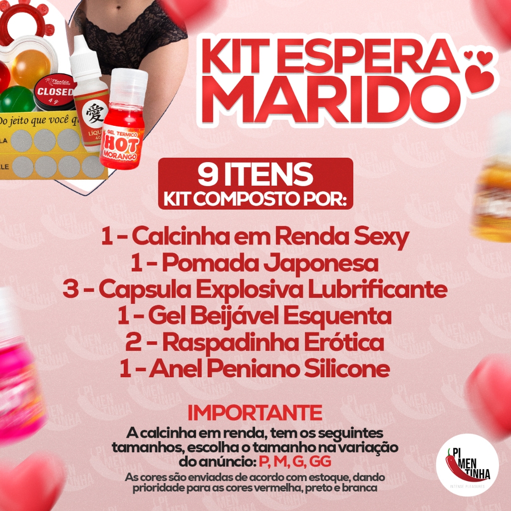 🧨 KIT ESPERA MARIDO – 9 ITENS PARA SURPREENDER E ESQUENTAR O CLIMA Um kit completinho, montado para transformar a noite do casal em um festival de sensações, brincadeiras e conexão. Simples, direto e irresistível — do jeitinho que seu parceiro(a) não vai esquecer. ✨ O Kit contém: • 1 Calcinha em Renda Sexy – Espera Marido Delicada, confortável e provocante, perfeita para surpreender. • 1 Pomada Japonesa – Sensação de Aumento e Aquecimento Proporciona estímulo, aquecimento e uma sensação intensa. • 3 Cápsulas Explosivas Lubrificantes Aromáticas – Embalagem Coração Lubrificação gostosa, toque suave e explosão de aroma. • 1 Gel Beijável com Efeito Esquenta Ideal para brincadeiras a dois, com sensação quente e sabor. • 2 Raspadinhas Eróticas para Casais Joguinhos picantes que tornam tudo ainda mais divertido. • 1 Anel Peniano de Silicone Ajuda na performance e intensifica as sensações. 📌 IMPORTANTE A calcinha em renda está disponível nos tamanhos: P, M, G, GG Escolha o tamanho na variação do anúncio. As cores são enviadas conforme disponibilidade do estoque, dando prioridade para: vermelha, preta e branca.