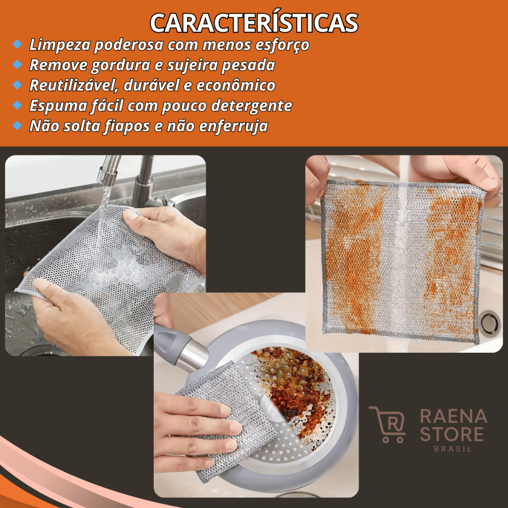Kit Esponja com Reservatório + Pano Aço Inox Cozinha Limpeza Pesada Panela Fogão Louça