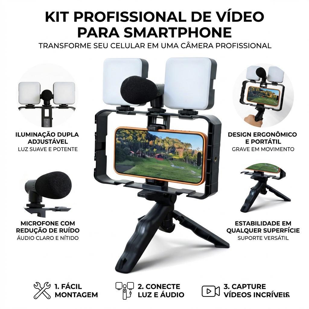 Kit Estabilizador de Vídeo com Gaiola e Tripé para Celular e Câmera - Suporte Profissional para Live e Vlog