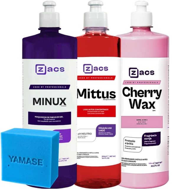 KIT CONTÉM: 1- MINUX 500ML 1- CHERRY WAX 500ML 1- MITTUS 500ML DESCRIÇÃO GERAL: CHERRY WAX 500ML É uma cera 4 em 1 desenvolvida para limpar, mascarar riscos e leves defeitos, proteger e promover brilho impecável na pintura veicular. É uma cera muito fácil de aplicar, com ótimo custo benefício e aromatizada com fragrância de cereja. MODO DE USAR: 1 - Agite bem antes de usar. 2 - Aplique o produto uniformemente com um aplicador de espuma ou microfibra em toda pintura. 3 - Após pelo menos 5 minutos, faça a remoção para promover acabamento de lustro utilizando uma toalha de microfibra limpa, macia e seca. MITTUS ZACS 500ML MITTUS é um lava autos concentrado e pH neutro que proporciona uma limpeza suave e eficiente. Sua fórmula contém agentes condicionadores e tensoativos especiais que auxiliam na remoção da sujeira sem danificar a pintura do veículo. Possui um alto grau de lubrificação, o que reduz o atrito entre a luva de microfibra e a pintura, prevenindo micro-riscos. Além disso, o produto promove brilho e aspecto de renovação da pintura. MODO DE USAR: 1- Diluir em torno de 10 ml de MITTUS em 4 litros de água. 2- Com o auxílio de uma luva de microfibra, inicie a pré-lavagem começando pela parte superior do veículo. 3- Mergulhe a luva na solução e esfregue suavemente até completar todo o veículo. 4- Enxágue em seguida até a remoção de todo o produto. 5- É recomendável o uso de uma toalha de secagem para finalizar MINUX ZACS 500ML O Minux Selante para Pneus Zacs é desenvolvido para proteger, hidratar e renovar o aspecto dos pneus, formando uma camada resistente contra sujeiras e ressecamento. Sua formulação garante brilho equilibrado e acabamento duradouro, mantendo a aparência de pneus novos. Ideal para uso profissional e doméstico, proporciona praticidade na aplicação e alta performance. MODO DE USAR: 1. Certifique-se que os pneus estejam limpos e secos. 2. Com o auxílio de um pincel ou aplicador de pretinho, aplique uma pequena quantidade na esponja, e espalhe sobre o pneu de forma uniforme. Repita o processo até que esteja do seu gosto. 3. Espere o tempo de cura até 30 minutos.