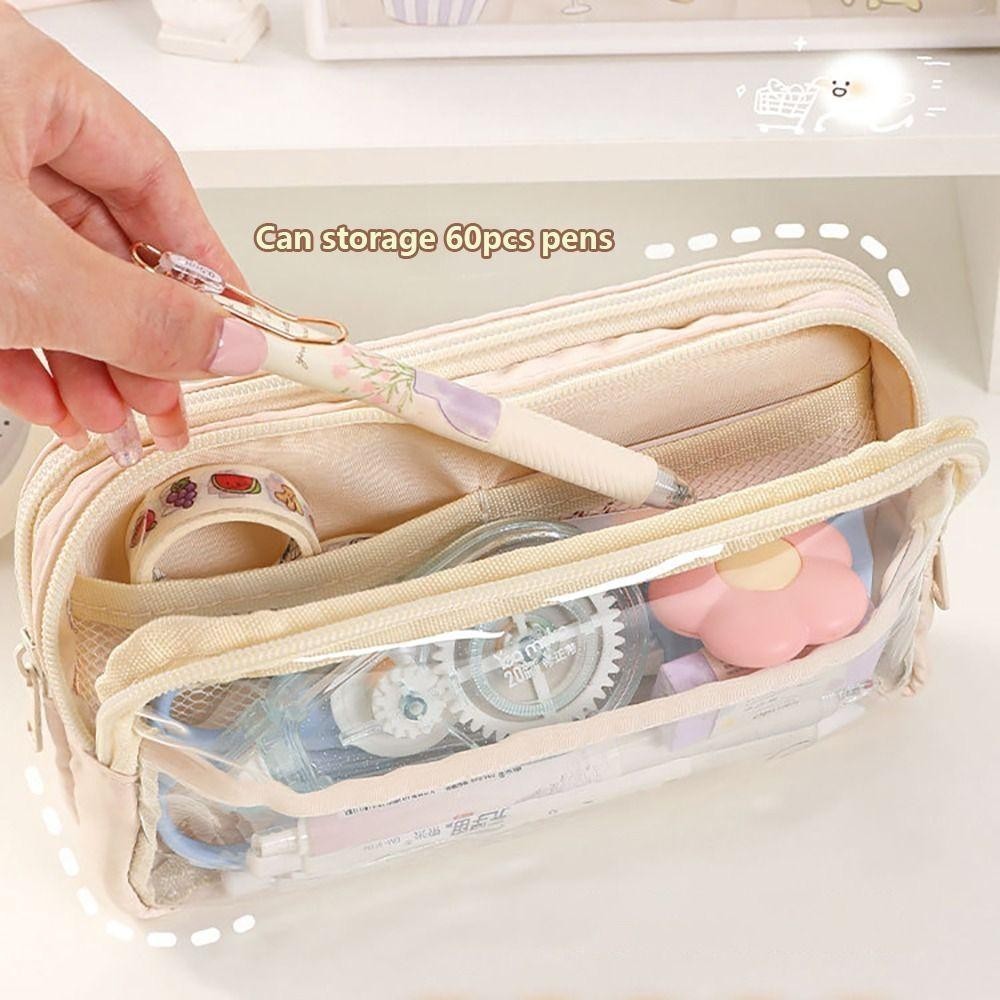Kit Estojo Escolar: Estojo com 5 partmentos de Couro PU + Estojo Transparente PVC, Alta Capacidade, Portátil para Pap