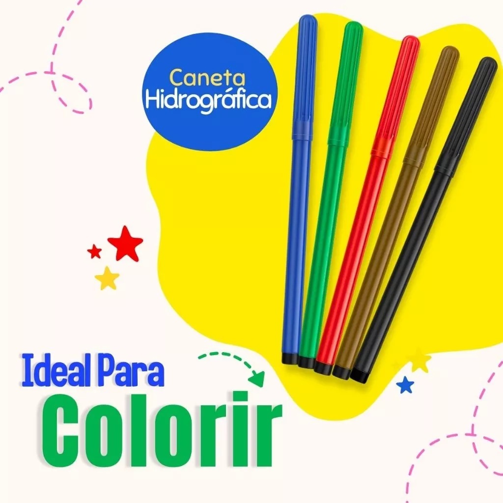Escolha se você quer 5 ou 10 unidades com 6 cores cada!! As Canetinhas Hidrográficas são ideais para a diversão e criatividade das crianças. Com tinta à base de água, oferecem cores vivas e traços uniformes, sendo mais seguras e com menor odor em comparação às canetas permanentes. Especificações do Produto Medidas Aproximadas Comprimento: 13,3cm. Espessura da ponta: 2mm. Composição Resina termoplástica, carga a base de aguá, corantes e umectantes, pavio de acetato e ponta de fibra de poliéster. AGUARDAMOS A SUA COMPRA! 😉 Quem somos❓ Estamos preparados para te atender com máxima excelência. Somos uma loja online, distribuidores de um das lojas mais tradicionais da Rua 25 de Março! Qual o prazo de postagem❓ Após a confirmação da compra enviaremos seu produto com agilidade. Tem a pronta entrega❓ Sim , todos nossos produtos anunciados tem estoque no Brasil para envio imediato.