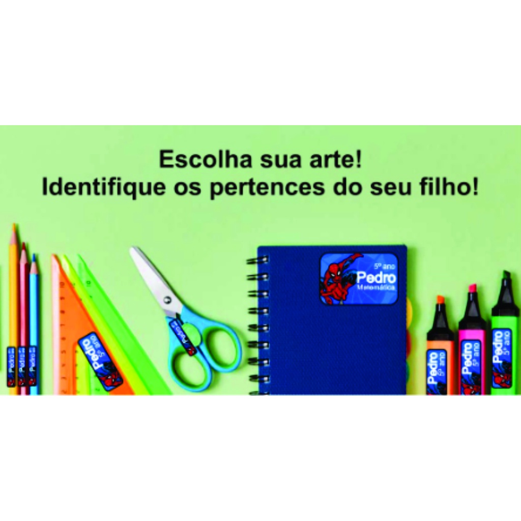 PRODUTO PERSONALIZADO, SE NAO HOUVER RETORNO DE APROVAÇÃO EM 12H SERÁ ENVIADO E NÃO SERÁ ACEITO DEVOLUÇÃO OU REEMBOLSO por ser PERSONALIZADO Kit de 60 (20 de cada tamanho) Kit de 90 (30 de cada tamanho) Kit de 80 (10 maiores, 20 médias e 50 pequenas) Etiquetas para uso escolar, impressa em VINIL ADESIVO alta qualidade TEMA A SUA ESCOLHA, mandar informações pelo chat após a compra Kit contém 9x6cm ideal para cadernos, livros, etc 6x2cm ideal para acessórios, tesoura, cola, régua, e demais 5x1 ideal para lápis, canetas, itens menores