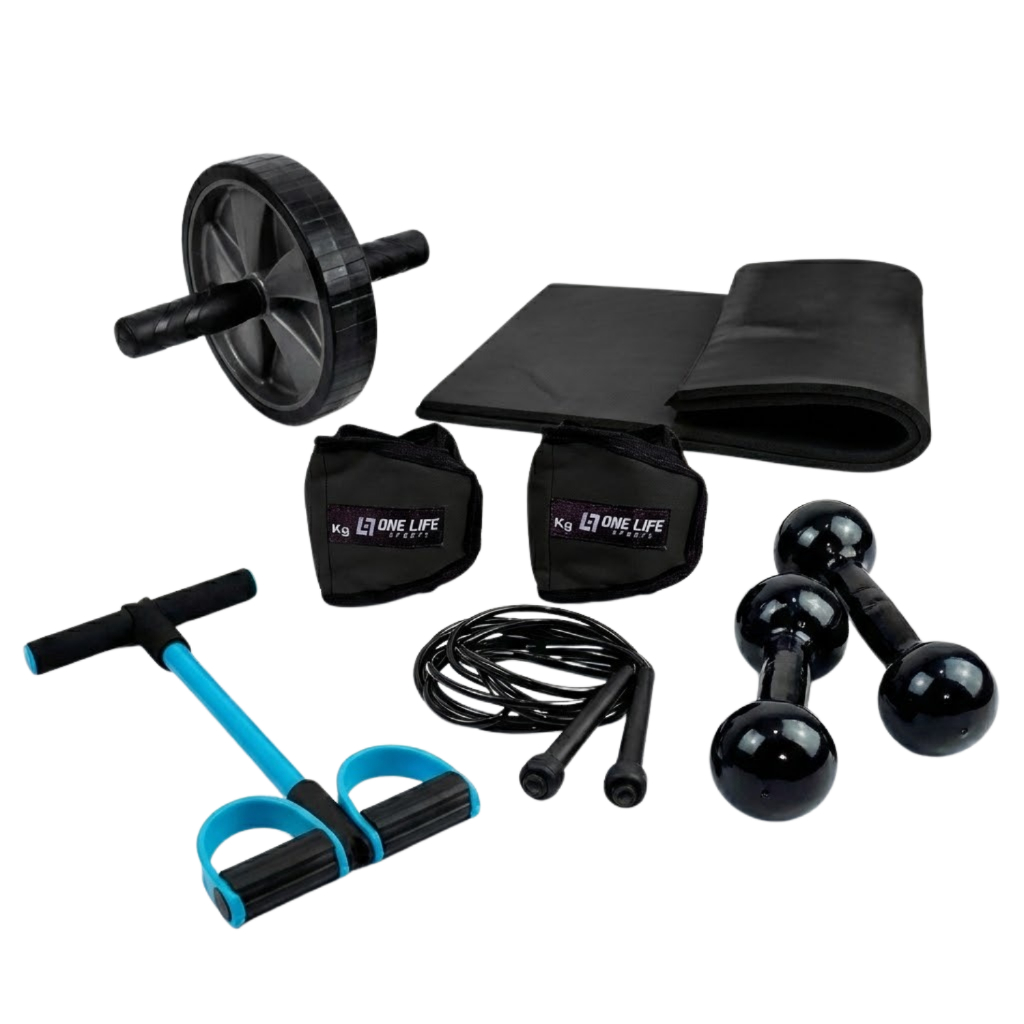 Kit Exercícios Casa – One Life Sports® – Colchonete Caneleira 3kg Halter 1kg Roda Extensor Corda