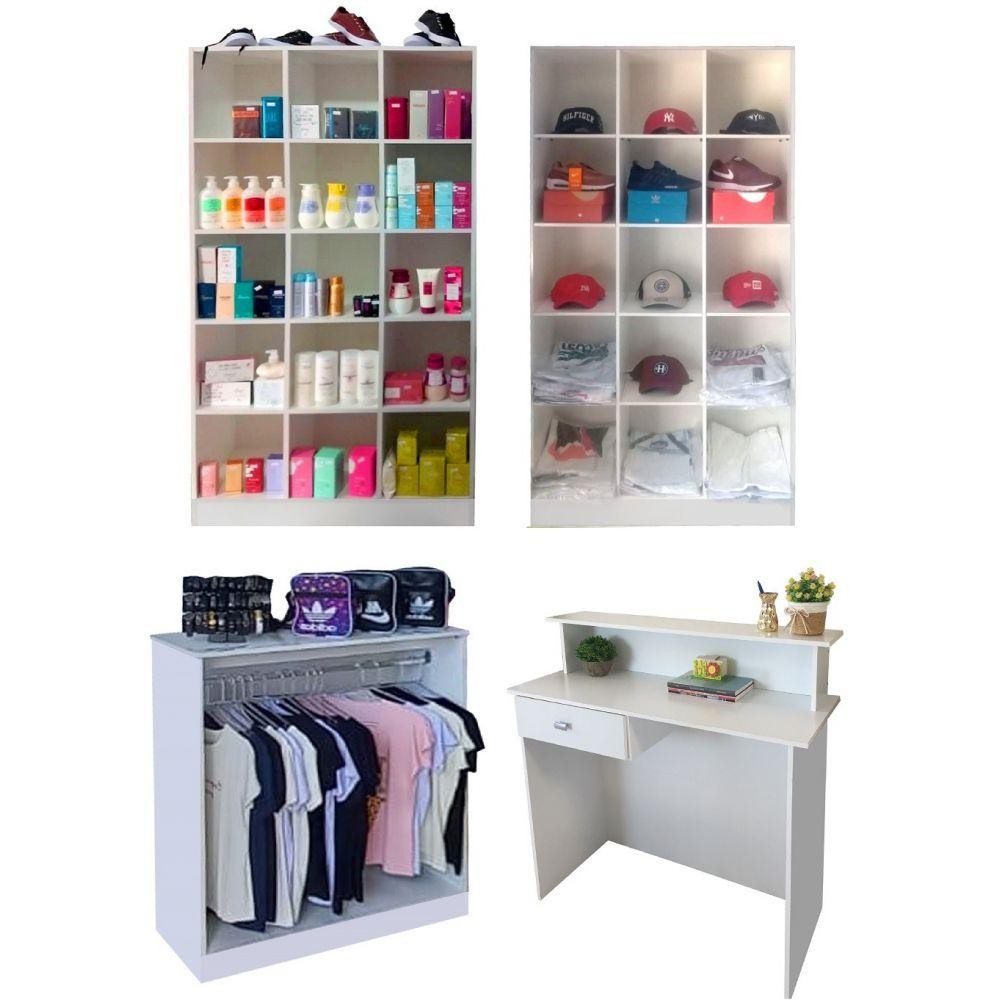 Kit Expositor 2 Colméias 15 Nichos 1 Balcão Arara e 1 Balcão Atendimento A Magia Móveis produz expositores de uma beleza única, totalmente diferenciados e com muito espaço para armazenar e expor tudo o que você precisa, deixando sua loja super linda, alavancando suas vendas. Feitos de MDP, são bem embalados, o que garante que cheguem perfeitos para você. Seu espaço ficará super otimizado e lindo! Kit com 4 peças para loja, contendo: - 02 Colméia Bia - 01 Balcão Arara Carol - 01 Balcão para Atendimento com Gaveta - Colméia Bia: possui 15 nichos e é excelente para armazenar e expor, ajuda na decoração e deixa tudo organizado e bem visível. Altura: 182cm x Largura: 90cm x Profundidade: 34cm Dimensões de cada nicho: Altura 33cm x Largura 28cm - Balcão Arara Carol: perfeito para centro de loja, próximo à vitrine ou coladinho na parede. Nele você pendura várias peças de roupa e sobre o tampo poderá expor diversos objetos e até atender seus clientes. Altura: 97cm x Largura: 84cm x Profundidade: 36cm - Balcão de Atendimento com Gaveta: Perfeito para você atender seu cliente! Super prático, deixa tudo organizado e mantém a discrição no atendimento. Altura: 93cm x Largura: 90cm x Profundidade: 36cm Marca: Magia Móveis Garantia: 03 meses contra defeitos de fabricação