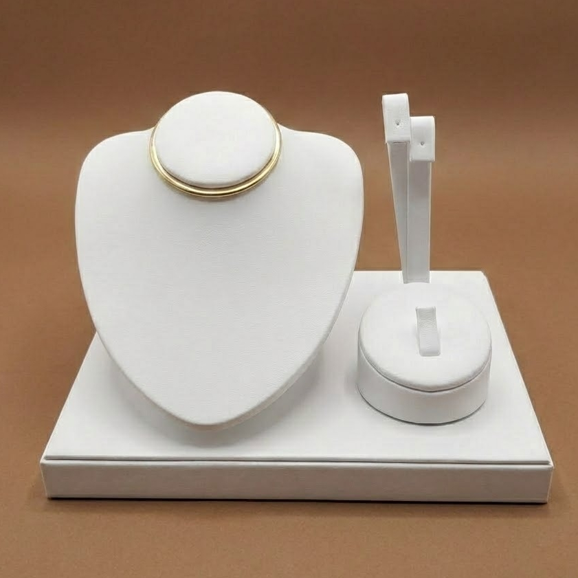 Transforme a apresentação das suas peças com este Expositor de Joias de Luxo. Seja para a vitrine da sua loja, para tirar fotos profissionais para redes sociais ou para organizar sua penteadeira, este display é a escolha perfeita. A cor preta é ideal para criar contraste, fazendo com que o brilho do ouro, da prata e das pedras preciosas se destaque muito mais aos olhos do cliente. ✨ POR QUE ESCOLHER ESTE EXPOSITOR? Kit Completo 3 em 1: Projetado para expor as três principais peças de venda (Colar, Brinco e Anel) em um único lugar. Acabamento Premium: Material de alta qualidade (aparência de couro sintético/PU) que protege as peças contra riscos e arranhões, além de ser fácil de limpar. Design Minimalista: O design limpo e moderno mantém o foco totalmente na joia. Estabilidade: Possui uma base retangular firme que evita que o expositor tombe, mantendo a organização impecável.