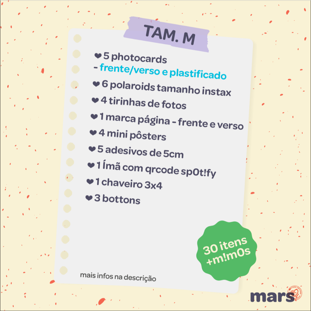 ‼️Produto sob encomenda. Fique atento ao prazo de confecção. ‼️ 🍥 Personalização com seu bias: Alguns itens são padronizados com o grupo. Os itens personalizados serão: bottons, chaveiro, photocards, polaroids, tirinha de fotos e alguns dos mini pôsters. 📐 Tamanho dos packs e quantidade total de itens: • Kit P – 20 itens • Kit M – 30 itens • Kit G – 43 itens 🎯 Bottons por kit: • Kit P: 1x 3,8cm + 1x 4,5cm • Kit M: 2x 3,8cm + 1x 4,5cm • Kit G: 2x 3,8cm + 2x 4,5cm 🃏 Photocards Plastificados com polaseal Mais resistente e com acabamento brilhoso 📌 Acabamentos dos itens: • Impressão em alta com tintas originais epson • Papel Fotográfico glossy (brilhoso) de alta gramatura (mais grossinho) • Laminação com BOPP a quente (protege as cores e camada extra de brilho) ⚠️ Atenção: • Itens não são à prova d’água • Os acabamentos protegem contra desbotamento, mas não impermeabilizam. • Imagens são aleatórias, conforme o tema escolhido. • Não é possível alterar ou personalizar esse anúncio. 💬 Dúvidas? Fale conosco! Ficaremos felizes em te ajudar ❤️😊 ❥ Loja Mars (˶ᵔ ᵕ ᵔ˶)