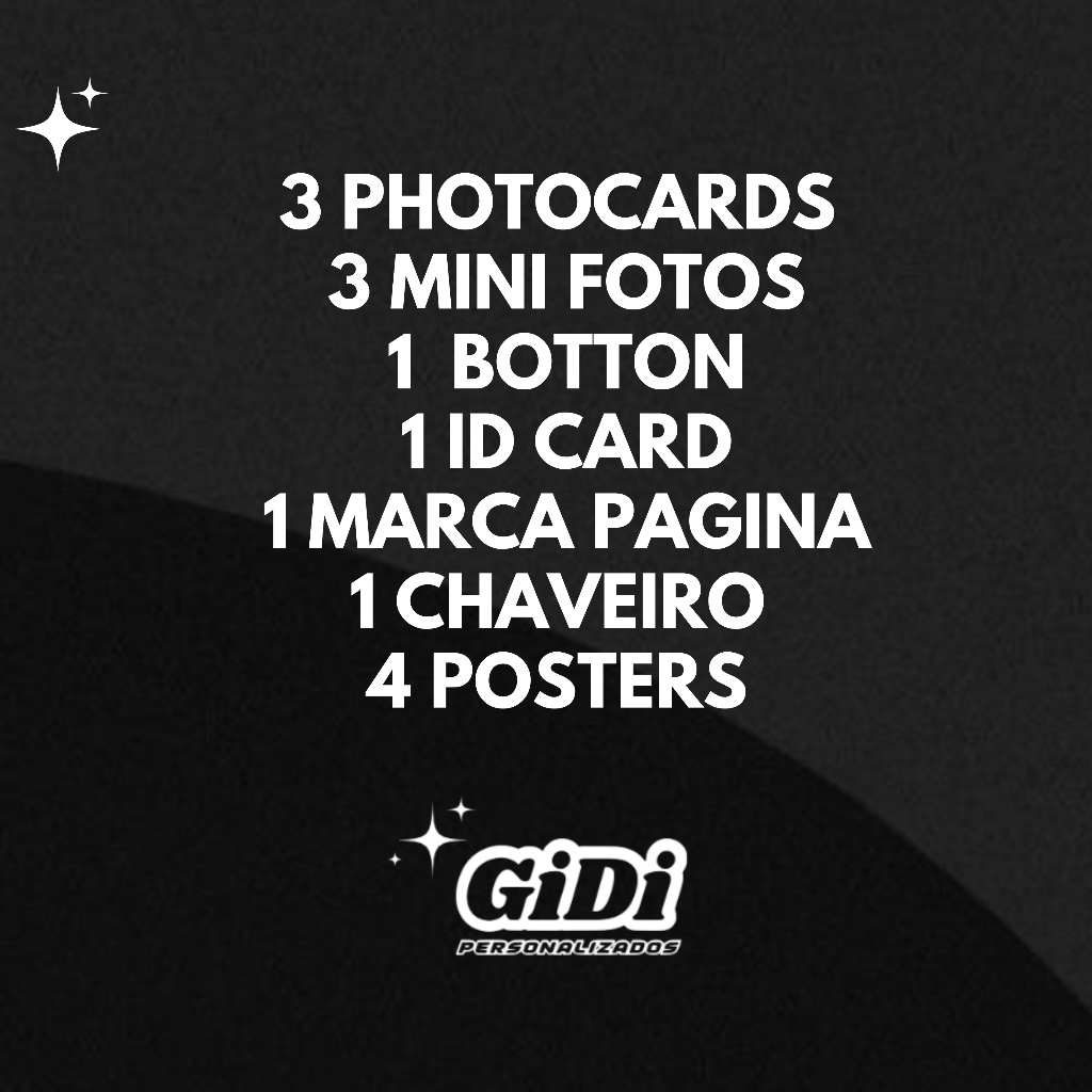 Escolha seu artista Favorito e receba 40 personalizados dele! Importante: o kit vem com 14 itens : - 3 PHOTOCARDS - 3 MINI FOTOS - 1 BOTTON - 1 ID CARD - 1 MARCA PAGINA - 1 CHAVEIRO - 4 POSTERS ATENÇÃO: Opção Prontas - Os combos Prontos não podem ser alterados fotos específicas ou foco em um artista específico. São combos já montados não podendo ser modificados ATENÇÃO: Opção Personalize do seu jeito (O combo Personalize do seu jeito é 100% personalizado. Logo, você pode escolher até 2 artistas em um mesmo combo, ou um grupo com um foco em um artista específico. Pode escolher as fotos que deseja e até as fotos de cada item) PRODUÇÃO: Envio em até 10 dias úteis! Papel Fotográfico 180g: Oferece uma excelente qualidade de imagem. Espero que goste! 😊