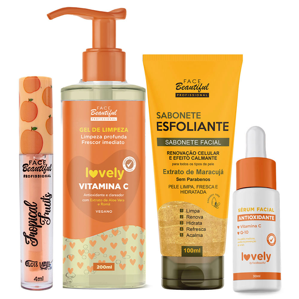 Transforme sua rotina de cuidados com a pele com este kit facial completo, desenvolvido para limpeza profunda, renovação celular, hidratação intensa e proteção antioxidante. Ideal para quem busca uma pele mais iluminada, macia e saudável no dia a dia. Conteudo Do Kit: Gel de Limpeza 200ml: promove limpeza profunda, remove impurezas e oleosidade, deixando sensação de frescor imediato. Fórmula vegana com ação antioxidante. Sabonete Esfoliante Facial 100ml: auxilia na renovação celular, remove células mortas e ajuda a manter a pele limpa, macia e calmada. Sérum Facial 30ml: ajuda a uniformizar o tom da pele, combate os radicais livres e contribui para uma aparência mais jovem e luminosa. Gloss Labial Tropical Fruits (4ml): hidrata os lábios e proporciona brilho suave com fragrância tropical. Benefícios do kit: Limpa profundamente Esfolia e renova a pele Hidrata e refresca Ação antioxidante Ajuda a deixar a pele mais iluminada e uniforme Indicado para todos os tipos de pele, este kit é perfeito para uso diário ou para presentear. Uma rotina prática e eficiente para realçar sua beleza natural.
