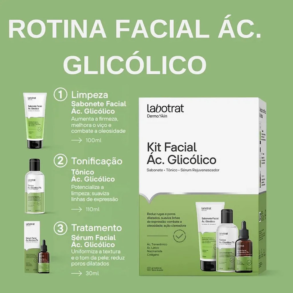 Kit Facial Labotrat Ácido Glicólico 7% 3 Unidades O Kit Facial Ácido Glicólico Labotrat combina ativos de alta performance com a Tecnologia Drone Bio-guiada, que agem na célula alvo potencializando e bioestimulando a remodelação e a produção de colágeno garantindo maior sustentação da pele. Remove impurezas e resíduos de poluição e atua sinergicamente na renovação celular e na redução de rugas, linhas finas e poros dilatados. Eficaz no clareamento e prevenção de marcas escurecidas e no combate e prevenção da acne. Restaura a luminosidade e uniformidade, melhora a hidratação, a firmeza e a elasticidade da pele, deixando-a hidratada, uniforme e radiante. Tratamento rejuvesnescedor que não pode faltar na sua rotina de skincare. O kit contém: 1- Sabonete Facial Ácido Glicólico: Responsável por limpar profundamente a pele, removendo impurezas e excesso de oleosidade, preparando-a para os próximos passos da rotina de cuidados. ? 1- Tônico Facial Ácido Glicólico: Formulado com 7% de Ácido Glicólico e 3% de Ácido Lático, este tônico potencializa a limpeza, promove esfoliação química suave, clareia manchas, uniformiza o tom da pele, controla a oleosidade e reduz poros dilatados. ? 1- Sérum Facial Ácido Glicólico: Este sérum atua na redução de rugas e linhas de expressão, melhora a textura e elasticidade da pele, uniformiza o tom e reduz poros dilatados, deixando a pele mais firme e rejuvenescida. Benefícios: Renovação Celular: A combinação dos produtos estimula a regeneração da pele, resultando em uma aparência mais lisa e uniforme. Clareamento de Manchas: Os ativos presentes auxiliam na redução de hiperpigmentações, promovendo um tom de pele mais homogêneo. Controle da Oleosidade: Ajuda a equilibrar a produção sebácea, conferindo uma sensação de frescor e limpeza prolongada. Hidratação e Firmeza: Melhora a elasticidade e firmeza da pele, proporcionando hidratação adequada e prevenindo o ressecamento. Modo de usar: Limpeza: Aplique o Sabonete Facial sobre o rosto úmido, massageie suavemente e enxágue com água.? Tonificação: Com um algodão, aplique o Tônico Facial em todo o rosto, evitando a área dos olhos. Não é necessário enxaguar.? Tratamento: Aplique algumas gotas do Sérum Facial no rosto limpo e seco, massageando até completa absorção.