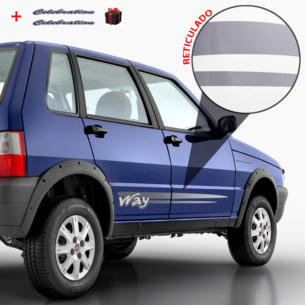 Adesivo Genérico. As Faixas Decorativas Adesivas além de determinar, em muitos casos, o modelo do veículo, também personalizam o seu carro e protegem a pintura. As Faixas Automotivas Decorativas são produzidas em vinil automotivo autocolante importado, dispensando a utilização de produtos para a fixação e já possuem verniz automotivo. Dessa forma, as faixas estão protegidas da ação do tempo (Exposição ao sol e a chuva). Kit Faixa Uno Way Até 2012 + Brinde Celebration - Serve nos modelos Uno Way 2 Portas e 4 Portas Características:1 Jogo de Faixas Laterais / Fabricado em Vinil Branco / Dimensões: 140,8 x 10,8 cm2 Adesivos Celebration * BRINDE * Quantidade: 1 Kit com 2 Faixas Laterais Fiat Uno Way + 2 Adesivos Celebration Observações:Material autocolante.Resistente à chuva e raios UV.Embalagem segura para o transporte.Vinil importado. Instruções Para Aplicação:1 - Limpe e remova qualquer impureza na área de aplicação do produto.2 - Limpe as mãos e remova o protetor do liner. Procure ter o mínimo de contato com a face adesiva.3 - Centralize o produto no local da aplicação. Após esse posicionamento,pressione o produto gradativamente, sempre do centro para as bordas.Procure retirar todas as bolhas.4 - Após finalizar a instalação, não tente retirar a peça para reposicioná-la,pois isso danificará o produto. OBS: Para limpeza e conservação do produto, utilize apenas água e sabão neutro e/ou automotivo.Recomendamos que a aplicação seja feita por um profissional. Garantia de 1 ano.