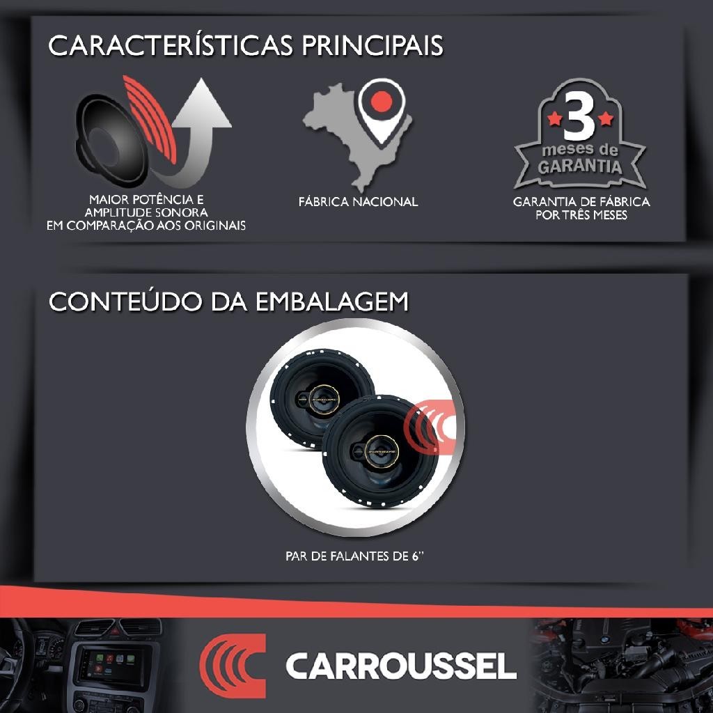 Carroussel Auto apresenta: Kit falantes 6 polegadas 120wrms 240wpmpo 4 ohms Hurricane A6 T Faça um upgrade no sistema de áudio original de seu carro! A linha Aurum foi desenvolvida com as mais novas tendências tecnológicas. Qualidade e resposta sonora de alta definição são algumas das características marcantes desta linha. Seu design inovador e moderno, aliado ao projeto dimensional adequado faz desta linha o que há de mais moderno no mercado. A sua construção robusta com carcaça injetada, cone de PP, borda de borracha e bobina de kapton em conjunto com torre de tweeters com imã de ferrite e piezo, que o tornou uma referência no mercado. Pode ser utilizado com amplificador ou diretamente no seu player. #ESPECIFICAÇÕES TÉCNICAS# - Marca: Hurricane - Linha: Aurum - Modelo: A6T - Tamanho do falante: 6" - Potência RMS: 120w (par) - Potência Máx PMPO: 240w (par) - Resposta de frequência: 80 hz - 22000 hz - Sensibilidade: 89 dB - Impedância: 4 ohms - Diâmetro de montagem do falante: 14 cm - Profundidade de montagem do falante: 4,3 cm - Garantia de fábrica: 03 meses #CONTEÚDO DA EMBALAGEM# - 2 falantes de 6” #OBSERVAÇÕES# - Este produto requer um profissional capacitado para realizar a instalação. Caso não possua um profissional de confiança entre em contato com o fabricante para melhor orientação. Não nos responsabilizamos por má instalação ou uso indevido do produto; - Lembrando que a qualidade do resultado final depende também da qualidade do seu reprodutor (player) e amplificador.