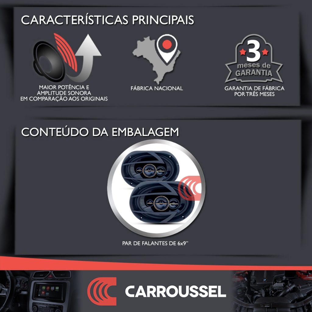 #Carroussel# - Nossa missão é garantir a sua satisfação; - Prezamos por produtos com alta qualidade e procedência; - Garantia junto aos fabricantes/importadoras; - Emitimos nota fiscal para garantir a sua segurança; - Disponibilidade dos produtos para agilizar a postagem em até 24hrs; - Consulte nossa descrição para mais informações e, se necessário, entre em contato com o fabricante para melhor orientação. ______________________________________________________________ Kit falantes 6x9 polegadas 260wrms 520wpmpo 4 ohms Hurricane A69 Q Faça um upgrade no sistema de áudio original de seu carro! A linha Aurum foi desenvolvida com as mais novas tendências tecnológicas. Qualidade e resposta sonora de alta definição são algumas das características marcantes desta linha. Seu design inovador e moderno, aliado ao projeto dimensional adequado faz desta linha o que há de mais moderno no mercado. A sua construção robusta com carcaça injetada, cone de PP, borda de borracha e bobina de kapton em conjunto com torre de tweeters com imã de ferrite e piezo, que o tornou uma referência no mercado. Pode ser utilizado com amplificador ou diretamente no seu player. #ESPECIFICAÇÕES TÉCNICAS# - Marca: Hurricane - Linha: AURUM - Modelo: A69 Q - Tamanho do falante: 6x9" - Potência RMS: 260w (par) - Potência Máx PMPO: 520w (par) - Resposta de frequência: 60 hz - 20000 hz - Sensibilidade: 89 dB - Impedância: 4 ohms - Diâmetro de montagem do falante: Oval 21,9 cm x 14,7 cm - Profundidade de montagem do falante: 8,1 cm - Garantia de fábrica: 03 meses. Código fabricante: A69 Q Código de barras: 7898338310761 Sku: CA030240 #CONTEÚDO DA EMBALAGEM# - 2 falantes de 6x9” - 2 grades de proteção #OBSERVAÇÕES# - Este produto requer um profissional capacitado para realizar a instalação. Caso não possua um profissional de confiança entre em contato com o fabricante para melhor orientação. Não nos responsabilizamos por má instalação ou uso indevido do produto; - Lembrando que a qualidade do resultado final depende também da qualidade do seu reprodutor (player) e amplificador.