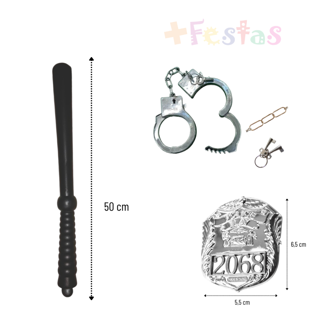Vendedor Indicado Shopee! Há mais de 10 anos no mercado de Distribuição Envio Imediato 🚚 Kit Policial Infantil Completo – Acessórios para Fantasia 👮♂️✨ Deixe a brincadeira ainda mais divertida com esse kit policial super completo! Ideal para festas à fantasia, Carnaval, Halloween, apresentações escolares e brincadeiras do dia a dia. O kit contém: • 1 Quepe policial preto OU boné FBI Preto - Atenção na escolha da variação ! • 1 Cassetete preto (50 cm) • 1 Algemas em plástico prata com chaves • 1 Distintivo policial (aprox. 6,5 cm x 5,5 cm) Detalhes do produto: • Algemas em plástico resistente na cor prata • Cassetete com aproximadamente 50 cm • Distintivo leve e detalhado • Quepe com emblema frontal estilo policial • Material leve e confortável Perfeito para compor fantasias infantis e garantir muita diversão com segurança. Produto leve, ideal para uso recreativo. Produto a pronta entrega Envio rápido e bem embalado 💙 Em caso de dúvidas, fale conosco pelo chat. Será um prazer atender você! 🛒✨