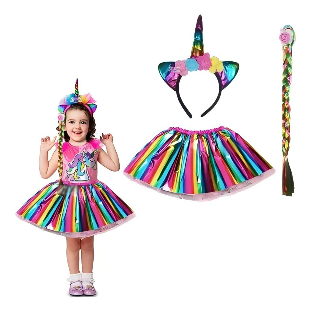 ATENÇÃO: Leia todo o anúncio antes da compra. DESCRIÇÃO: • Alguns modelos possuem o envio de cores aleatório, portanto NÃO sendo possível escolher. Não insista. • Imagens meramente ilustrativa, • Tamanho único: Veste de 3 - 8 anos. • Saia com elástico. • Fantasia unicórnio com saia. • Embalagem com 1 unidade. • Material: Tule, Cetim, Plástico, Tecido, Cabelo Sintético.