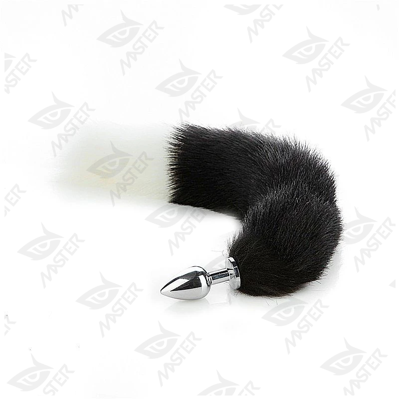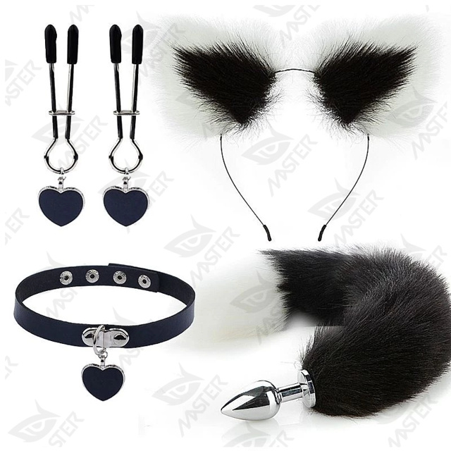 Kit Fantasia Plug Anal Tam P Pequeno Cauda Preta Raposa + Tiara Orelhinha + Grampo Prendedor de Mamilo + Gargantilha