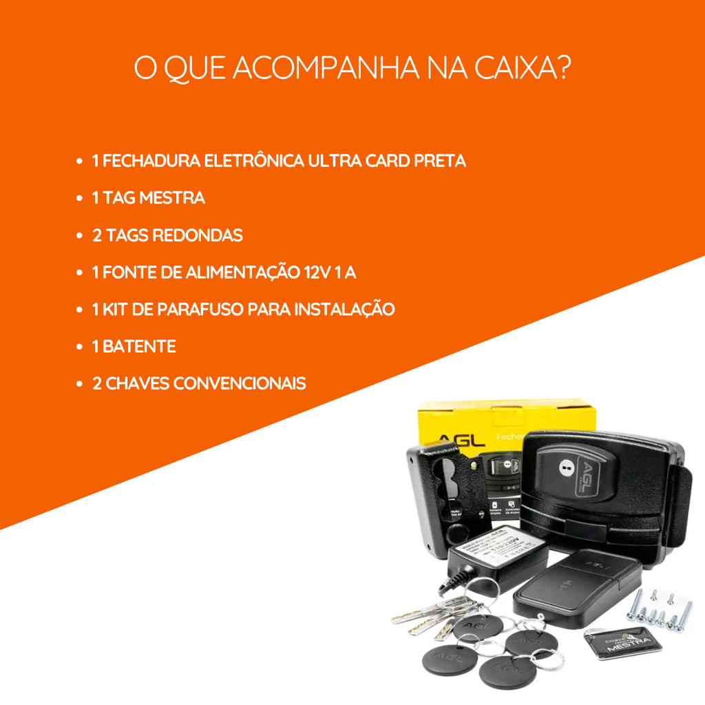 Fechadura Eletrônica AGL 12V Ultra Card - MF 13,56MHz (PRETO) Tenha mais segurança e praticidade com a Fechadura Eletrônica AGL Ultra Card, ideal para residências, escritórios e condomínios. Compatível com controle de acesso por cartão RFID (frequência 13,56MHz), ela permite a liberação rápida da porta com apenas um toque, dispensando o uso de chaves convencionais. Com alimentação de 12V, estrutura resistente e instalação simplificada, este modelo oferece o equilíbrio perfeito entre tecnologia, durabilidade e custo-benefício. ** Principais Características: ** OBS: Esse modelo de fechadura não tem WiFi integrado/incluso Tipo: Fechadura elétrica com controle por cartão RFID (13,56 MHz) Alimentação: 12V DC Instalação simples Ideal para portas de madeira ou metálicas Modo de operação: Abertura por cartão de proximidade (padrão MIFARE) Funcionamento: Fechadura com memória simples (sem registro de usuários) Compatibilidade: Pode ser integrada a sistemas de controle de acesso Cor: Preto (PT) Conteúdo da embalagem: Fechadura + acessórios para instalação o da fechadura (geralmente portas de madeira ou metálicas). *** Itens Inclusos*** - 1 FECHADURA ELETRÔNICA ULTRA CARD PRETA - 1 TAG MESTRA - 2 TAGS REDONDAS - 1 FONTE DE ALIMENTAÇÃO 12V 1 A - 1 KIT DE PARAFUSO PARA INSTALAÇÃO - 1 BATENTE - 2 CHAVES CONVENCIONAIS