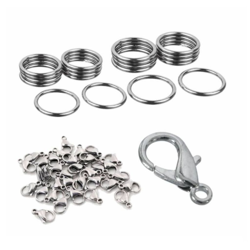 neste anúncio contém 25 fechos prata + 50 argolas 25 fechos dourado + 50 argolas tamanho - Tamanho do fecho: 12mm - Tamanho da argola: 6mm material: aço inoxidável