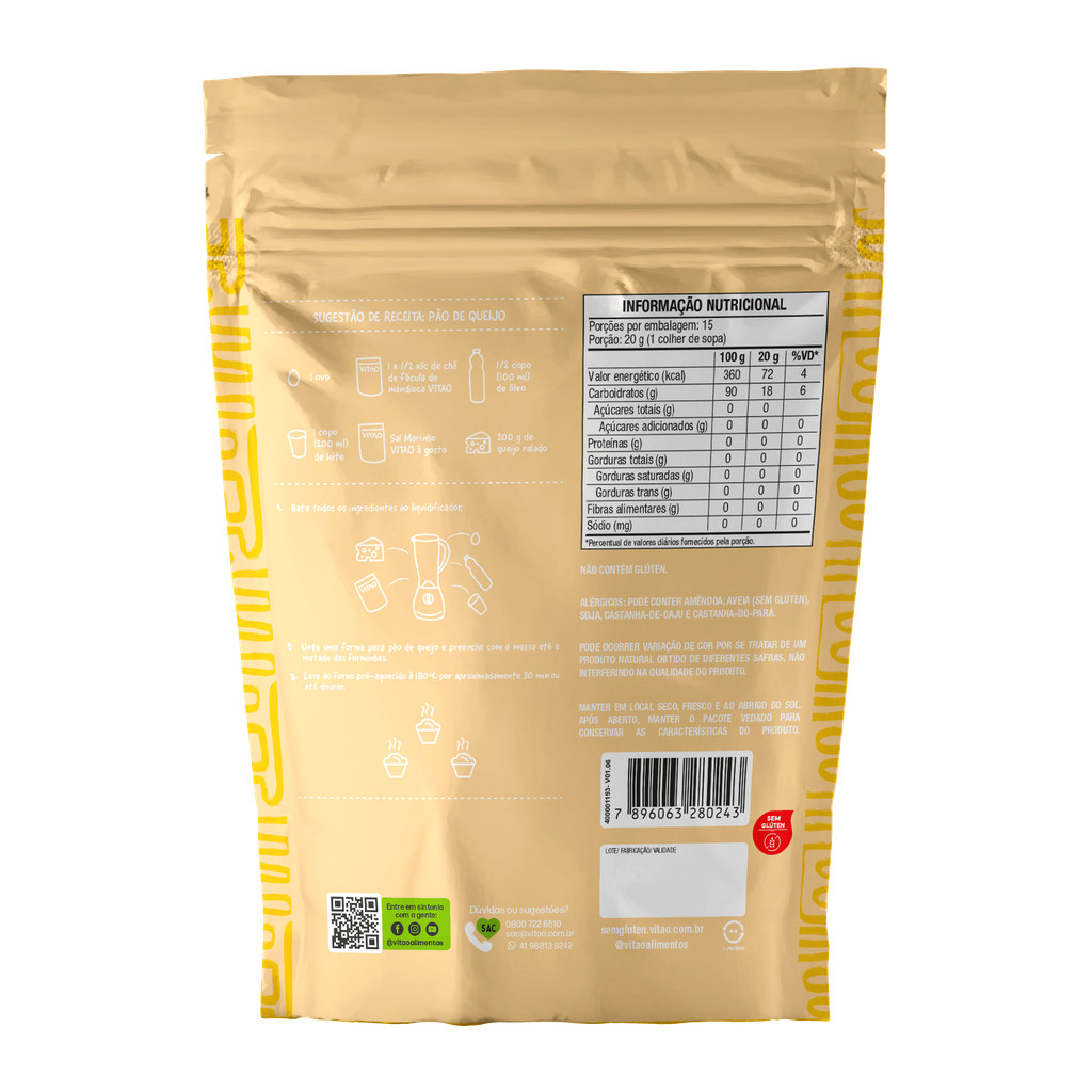A fécula de mandioca da Vitao é um ingrediente versátil e livre de glúten, obtido a partir da mandioca, uma raiz amplamente utilizada na culinária. Com uma textura fina e leve, a fécula de mandioca é conhecida por sua capacidade de espessar e dar consistência a diversos pratos, como sopas, molhos e sobremesas. Além disso, é uma excelente opção para pessoas com restrição ao glúten, sendo um substituto comum para a farinha de trigo em receitas. A fécula de mandioca também é rica em carboidratos e baixa em gorduras, tornando-se uma fonte de energia saudável. SUGESTÃO DE RECEITA: Pão de queijo - 1 e ½ xíc de chá de fécula de mandioca VITAO - 1 copo (200ml) de leite - ½ copo (100ml) de óleo - 1 ovo - 200 g de queijo ralado - Sal Marinho VITAO à gosto MODO DE PREPARO: - Bata todos os ingredientes no liquidificador. - Unte uma forma para pão de queijo e preencha com a massa até a metade das forminhas. - Leve ao forno pré-aquecido à 180ºC por aproximadamente 30 minutos ou até dourar. INGREDIENTES: Fécula de Mandioca. ALÉRGICOS: PODE CONTER AMÊNDOA, AVEIA (SEM GLÚTEN), SOJA, CASTANHA-DE-CAJU E CASTANHA-DO-PARÁ. NÃO CONTÉM GLÚTEN.