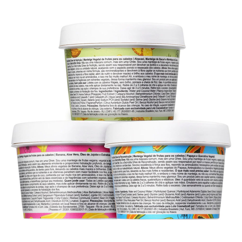 LOLA FROM RIO BE(M)DITA GHEE A lola apresenta sua coleção de manteigas vegetais de frutas para os cabelos. Nossas Ghees não são máscaras comuns, mas sim manteigas de frutas veganas,vegetais e orgânicas. São feitas com água de coco, conhecida por ser muito rica em aminoácidos, e isso as faz muito melhor! A textura já está perfeita para aplicação nos cabelos, não há necessidade de aquecer. Seus perfumes vêm de óleos essenciais e de fragrâncias com solventes vegetais, dessa forma elas mantêm todo seu glamour. E embora o nome de manteiga, elas não são comestíveis, ein! E pra terminar, mas com muito babado, elas são produtos capilares, somente, e maravilhosos, porque somos muito modestas. Be(M)dita Ghee Hidratação Banana e Aloe Vera. Sou a Be(m)dita Ghee de Hidratação, sendo assim sou altamente emoliente e proporciono hidratação profunda, de longa duração, para aqueles fios que estão opacos, sem brilho e necessitados de reposição hídrica. Ativos: Meus ativos vegetais de Banana, Aloe Vera, Óleo de Jojoba e Algas são ricos em proteínas que fortalecem e hidratam os fios de cabelos enfraquecidos, de dentro para fora, deixando os cabelos mais macios e brilhantes. O Aloe Vera é nosso super aliado para a saúde dos cabelos e couro cabeludo, permitindo que os nutrientes e as vitaminas penetrem com maior facilidade nos fios, o que potencializa o seu brilho e beleza. Modo de Usar: Retire de 2 a 3 colheres de chá e aplique nas mãos. Emulsione para espalhar e aplique do comprimento às pontas, logo após o shampoo de sua preferência. Deixe agir de 3 a 5 minutos. Retire todo o excesso. Não é necessário finalizar com condicionador. Use semanalmente ou quando se fizer necessário o processo de hidratação dos fios. Be(M)dita Ghee Nutrição Abacaxi e Manteiga de Bacuri. Sou a Be(m)dita Ghee de Nutrição, sendo assim sou responsável por devolver os lipídios e a oleosidade naturalmente presente nos fios. Devolvo também vitalidade, corpo e a umidade natural, acabando com o aspecto poroso e ressecado dos cabelos. Ativos: Meus ativos vegetais do Abacaxi, as Manteigas de Bacuri e Cacau, presentes em minha fórmula, são remineralizantes e devolvem à fibra capilar os nutrientes que foram perdidos. Auxiliam também no crescimento saudável dos fios, reparando a fibra capilar, além de nutrir e devolver maciez e brilho aos cabelos. Modo de Usar: Retire de 2 a 3 colheres de chá e aplique nas mãos. Emulsione para espalhar e aplique do comprimento às pontas, logo após o shampoo de sua preferência. Deixe agir de 3 a 5 minutos. Retire todo o excesso. Não é necessário finalizar com condicionador. Use semanalmente ou quando se fizer necessário o processo de nutrição dos fios. Be(M)dita Ghee Reconstrução Papaya e Queratina Vegetal. Sou a Be(m)dita Ghee de Reconstrução, sendo assim sou responsável por repor a massa perdida por nossos fios após os processos químicos, mecânicos e ambientais. Devolvo resistência e força aos fios, repondo os aminoácidos necessários para acabar com a quebra e os fios elásticos, trazendo de volta sua maleabilidade natural. Ativos: Meus ativos vegetais do Papaya, Aminoácidos e a Queratina Vegetal são remineralizantes e restauram a fibra capilar, de dentro para fora, deixando os fios mais fortes e resistentes. Modo de Usar: Retire de 2 a 3 colheres de chá e aplique nas mãos. Emulsione para espalhar e aplique do comprimento às pontas, logo após o shampoo de sua preferência. Deixe agir de 3 a 5 minutos. Retire todo o excesso. Não é necessário finalizar com condicionador. Use de 15 em 15 dias ou quando se fizer necessário o processo de reconstrução dos fios. Contém: 01 - Lola From Rio Be(M)dita Ghee Hidratação 100g; 01 - Lola From Rio Be(M)dita Ghee Nutrição 100g; 01 - Lola From Rio Be(M)dita Ghee Reconstrução 100g.