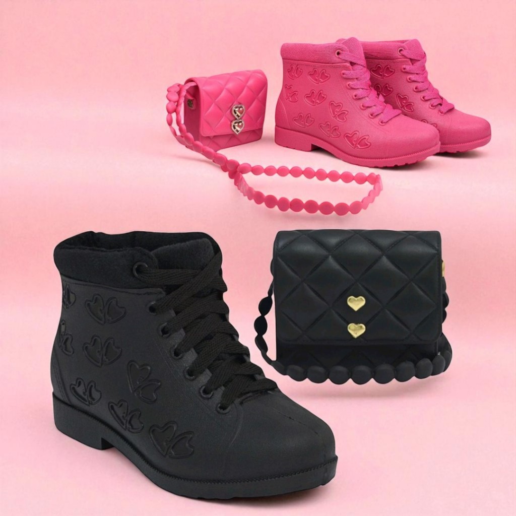 Conjunto Coração Feminino Infantil Botinha + Bolsa | Material Impermeável A botinha traz detalhe delicado em formato de coração 💖, enquanto a bolsinha completa o visual com muito charme. Ideal para passeios, festas ou para usar no cotidiano com muito estilo. ✅TABELA DE MEDIDAS ADULTO: (EXTERNAS) 26/27 – 19 cm 28/29 – 20 cm 30/31 - 21 cm 32/33 - 22 cm ✅ ESPECIFICAÇÕES: * Modelo : Coturno * Material : Pvc Expandido * Sola : Antiderrapante. * Respirável * Numeração dupla * Não causa odores ✅Cuidados com seu calçado. * Não pendurar no varal para evitar deformações. * Não deixar de molho. * Não colocar em máquina de lavar e/ou secar. * Secar em lugar arejado e longe do sol. * Lavar com sabão neutro e escova de cerdas macias. QUALQUER DÚVIDA, ENTRAR EM CONTATO PELO CHAT