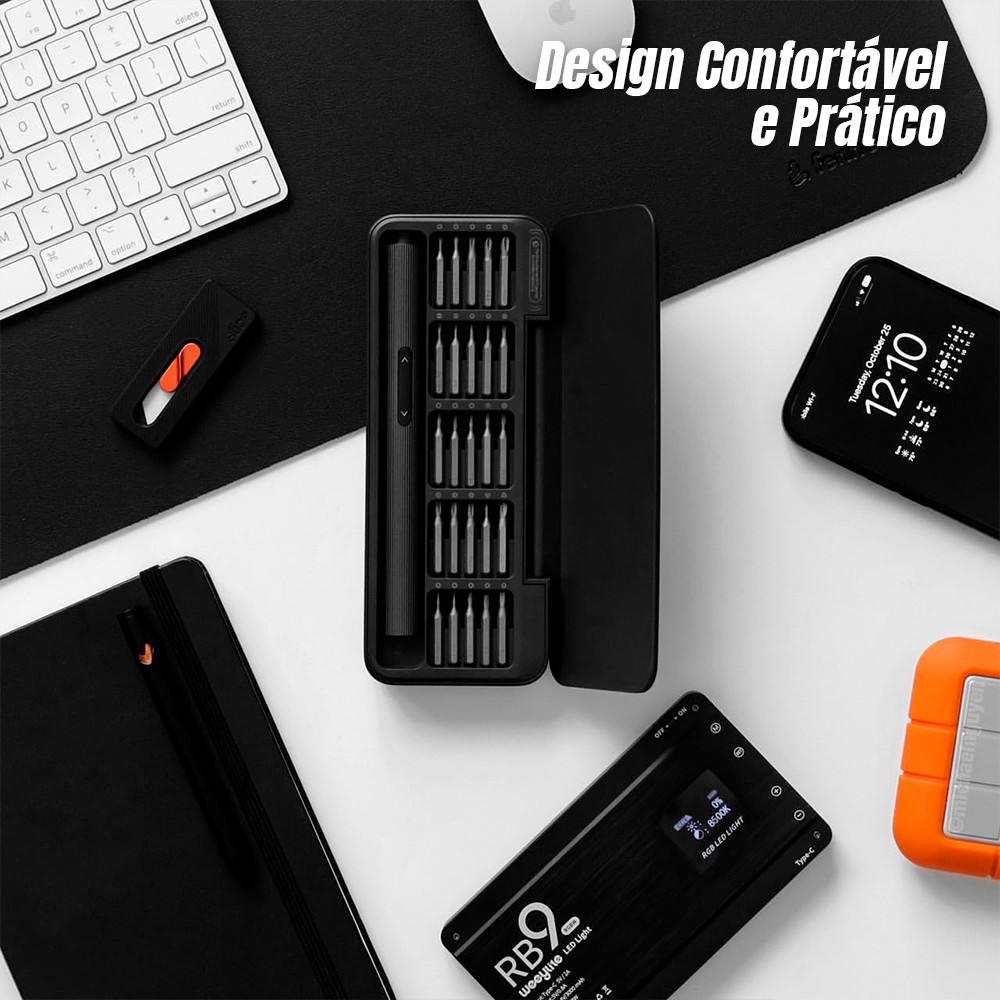 Kit Chave de Fenda Hoto, Aparafusadora Elétrica e Manual, 25 Bits S2, Motor 170 rpm, Bateria 350mAh, Engate Magnético 1. Função Elétrica e Manual em Um: A chave de fenda elétrica de precisão Hoto QWLSD010 oferece versatilidade, funcionando tanto de forma elétrica quanto manual. Com um botão intuitivo, você pode facilmente aparafusar ou desaparafusar com a seta para cima ou para baixo, ideal para diferentes tipos de reparos. 2. Motor Potente e Alta Velocidade: Equipada com um motor de alta potência que atinge até 170 rpm, a chave de fenda Hoto proporciona rapidez e eficiência ao realizar reparos. Ideal para tarefas que exigem precisão, ela facilita a montagem e o ajuste de parafusos de forma ágil. 3. Bateria Durável com Alta Capacidade: Com uma bateria de lítio de 350 mAh, a parafusadeira Hoto permite apertar até 500 parafusos com uma única carga. Isso garante longas sessões de trabalho sem a necessidade de interrupções para recarga, proporcionando alta autonomia. 4. 25 Pontas de Alta Qualidade com Engate Magnético: O conjunto inclui 25 pontas de chave de fenda de alta qualidade, feitas de aço S2, com diversos tipos, incluindo Allen, Philips e planas. O engate magnético garante maior praticidade, e a caixa de armazenamento com magnetizador facilita a troca de bits. 5. Design Confortável e Prático: A chave de fenda Hoto QWLSD010 possui uma alça de TPU que torna o uso mais confortável, mesmo durante longos períodos de trabalho. Sua construção ergonômica e leveza facilitam o manuseio e o controle durante os reparos. Garantia 90 dias