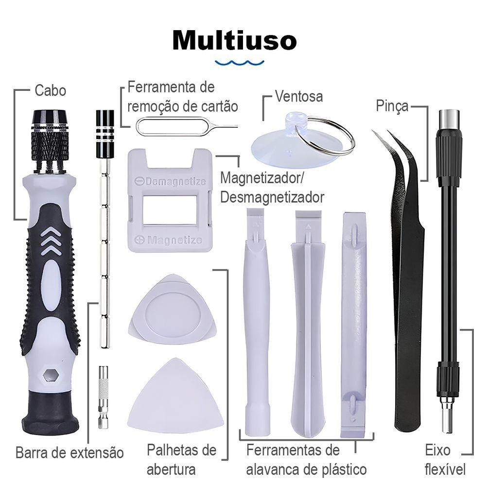Kit Ferramentas 115 Peças Chave De Fenda De Precisão Para Pcs Notebooks Celulares E Vídeo Games Otimize seus consertos com o Kit de Ferramentas de 115 Peças, ideal para profissionais e entusiastas de bricolagem. Equipado com 100 pontas intercambiáveis, incluindo Phillips, Flat, Torx, Pentalobe, Hex e muito mais, este conjunto oferece a solução perfeita para desmontagem e manutenção de eletrônicos, como smartphones, laptops, consoles de jogos e outros dispositivos delicados. - Material: Fabricado em aço cromo-vanádio, garantindo resistência ao desgaste e durabilidade excepcional com dureza superior a HRC65° - Pontas Magnéticas: Fixam parafusos com segurança, facilitando a manipulação de componentes pequenos e reduzindo o risco de perda. - Ergonomia e Precisão: O eixo temperado de óxido preto proporciona maior resistência e vida útil prolongada, ideal para uso contínuo. - Organização Inteligente: Acompanha maleta compacta e resistente, com fecho de segurança e slots moldados para cada ferramenta, permitindo acesso rápido e organizado. Perfeito para Profissionais e entusiastas: Seja para reparos eletrônicos, manutenção doméstica ou ajustes finos, este kit oferece a solução completa para qualquer tarefa. Itens Inclusos: - 1x Caixa de Ferramentas com 115 Peças.